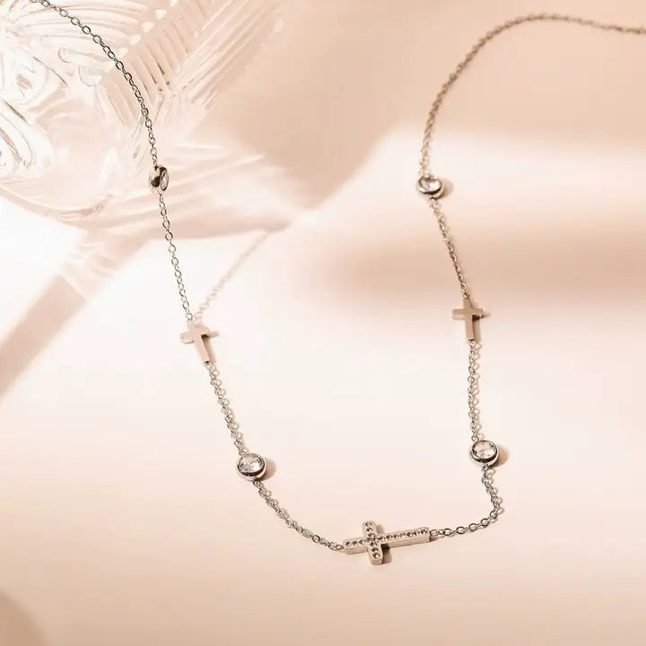 A Classic 18K Stainless Steel Tarnish-Free Rhinestone Cross and Rhinestone Circular Charm Station Necklace, this necklace features a delicate station design with sparkling rhinestone and a radiant rhinestone cross. Made from high-quality 18K stainless steel, this necklace is tarnish-free and designed for long-lasting wear. Product Details: length: 16" ext: 2" ext clasp: Lobster Claw Metal finish: Stainless Steel 18K Gold, Silver product: Lead & Nickel Compliant anti-tarnish: Tarnish Free, Non-Tarnish