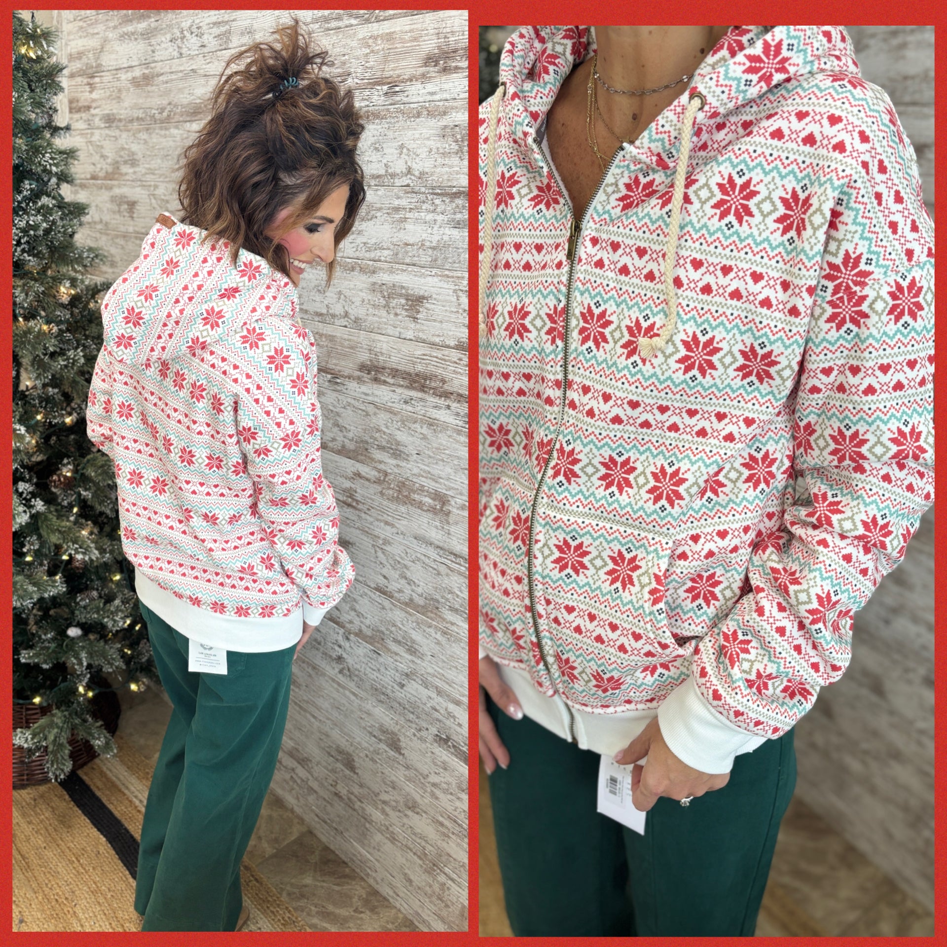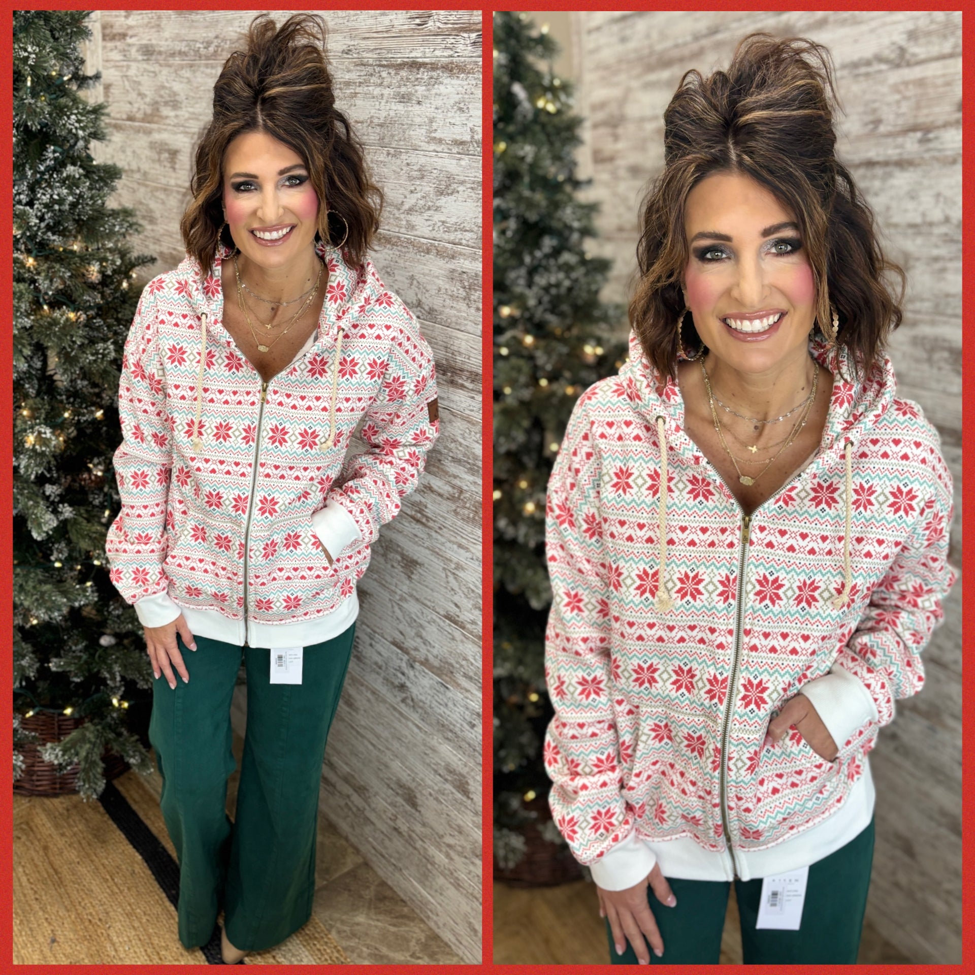 This fleece-lined full-zip is the ultimate cozy layer, featuring a classic Fair Isle print that brings all the festive, lodge-worthy vibes. Soft on the inside and stylish on the outside, it’s perfect for chilly mornings, cabin weekends, or holiday movie marathons.