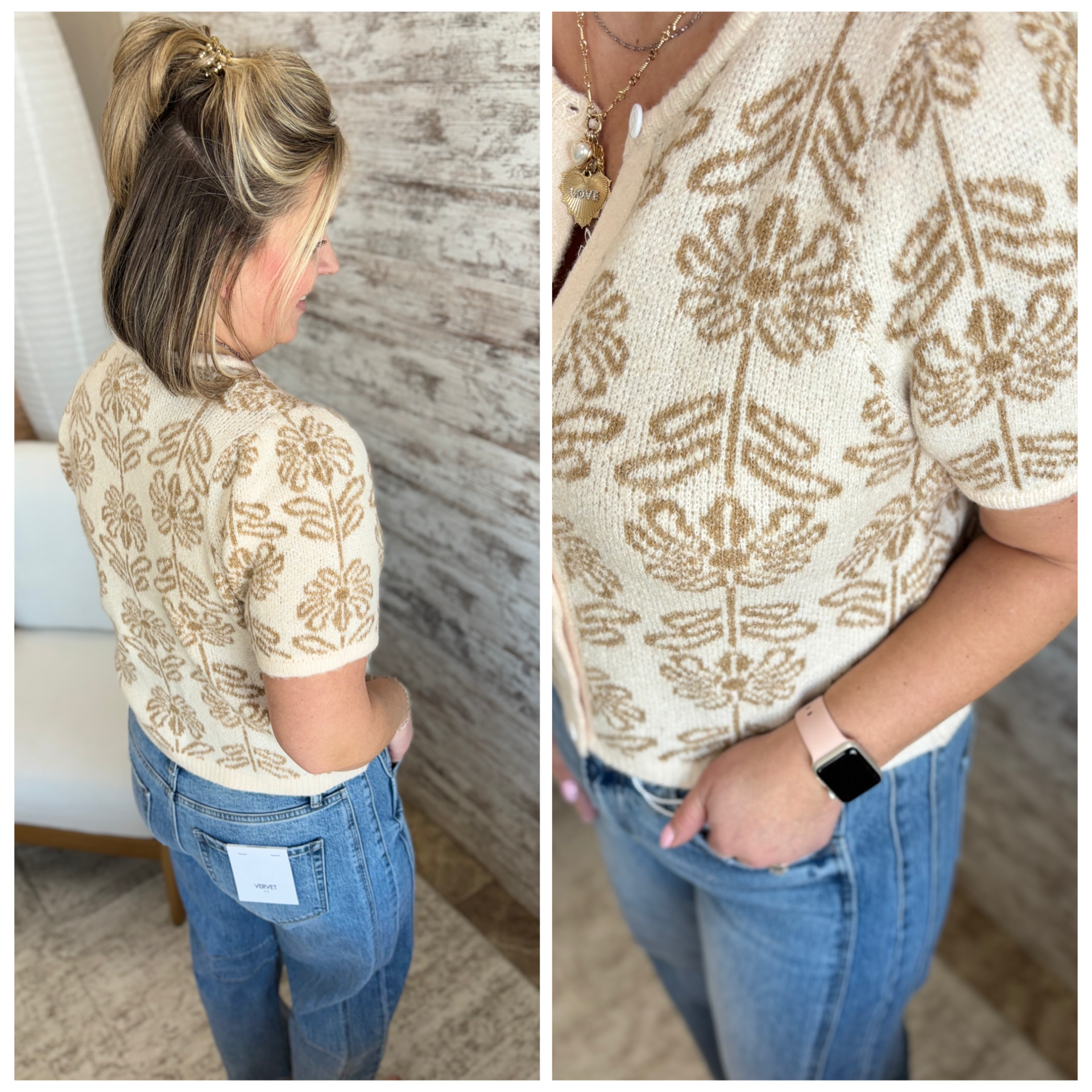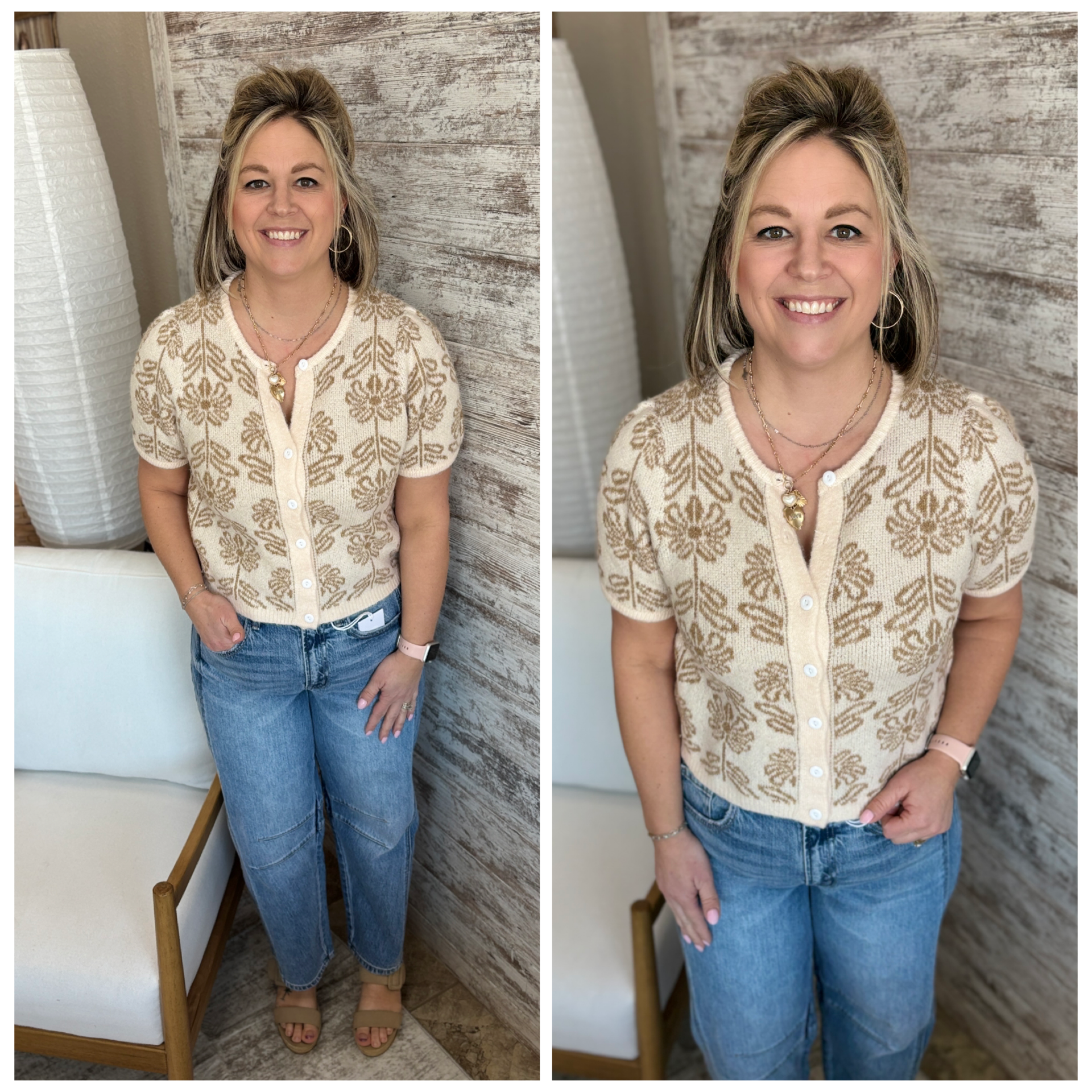 Floral knit short puff sleeve sweater cardigan + Ribbed round neck + Short puff sleeves + Button down placket + Relaxed fit + Ribbed hem + All-over floral knit design