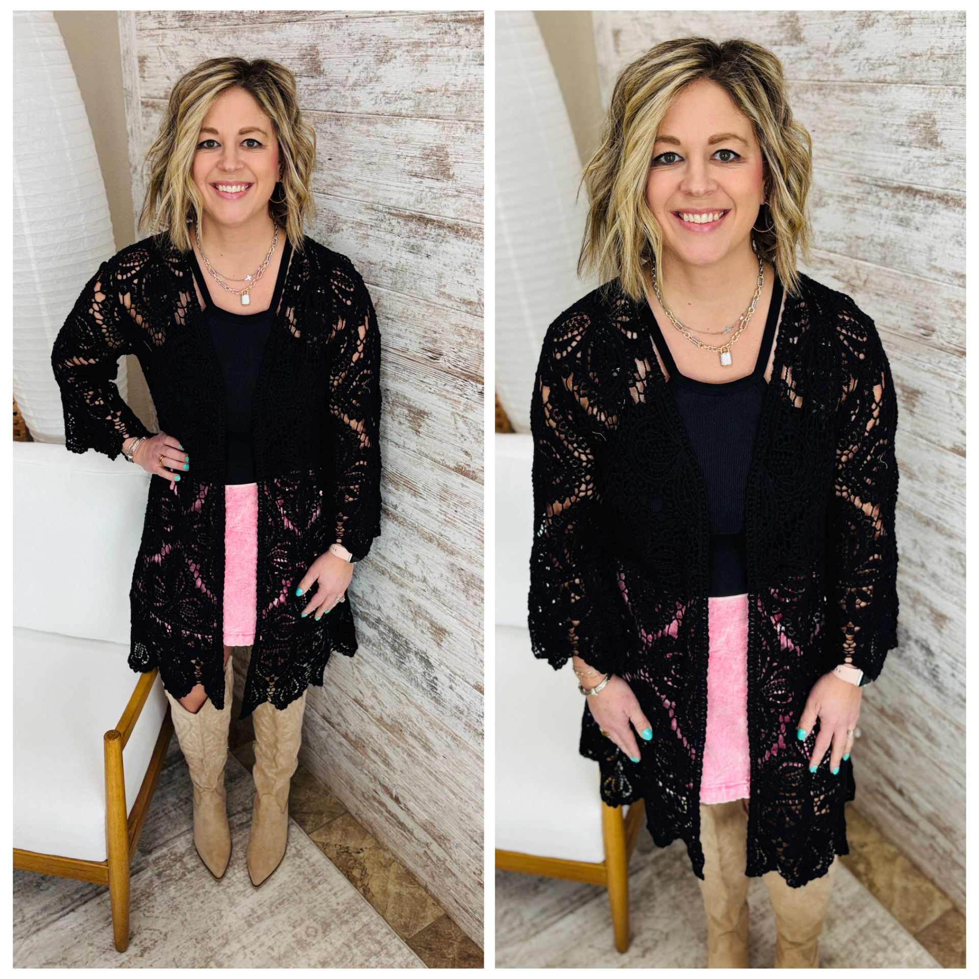 The crochet open-front knee-length cardigan features intricate bell sleeves