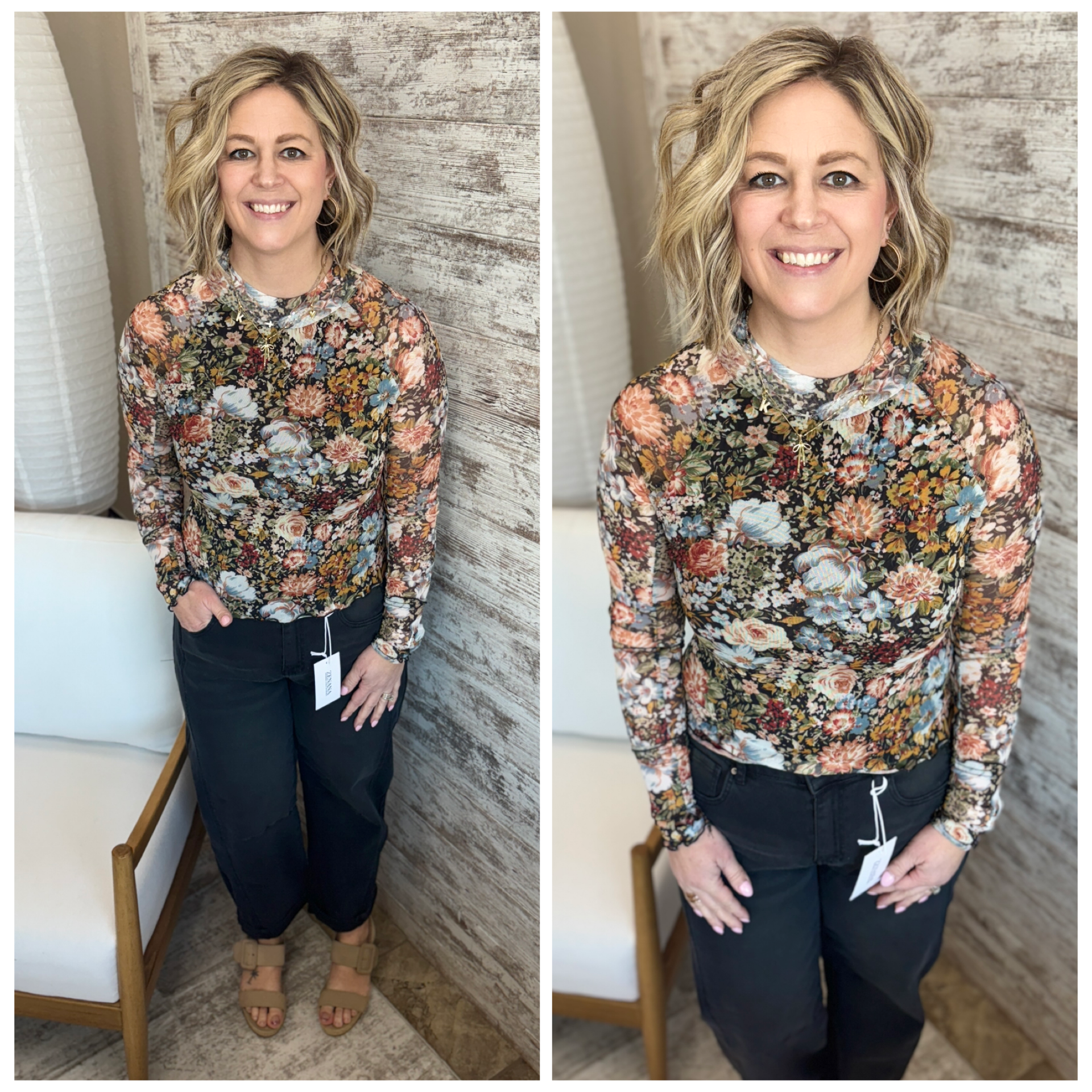 floral print, knit top with the following features: Semi-sheer mesh fabric. High neckline. Long sleeves with ruffle cuffs and thumb holes. Fitted silhouette.