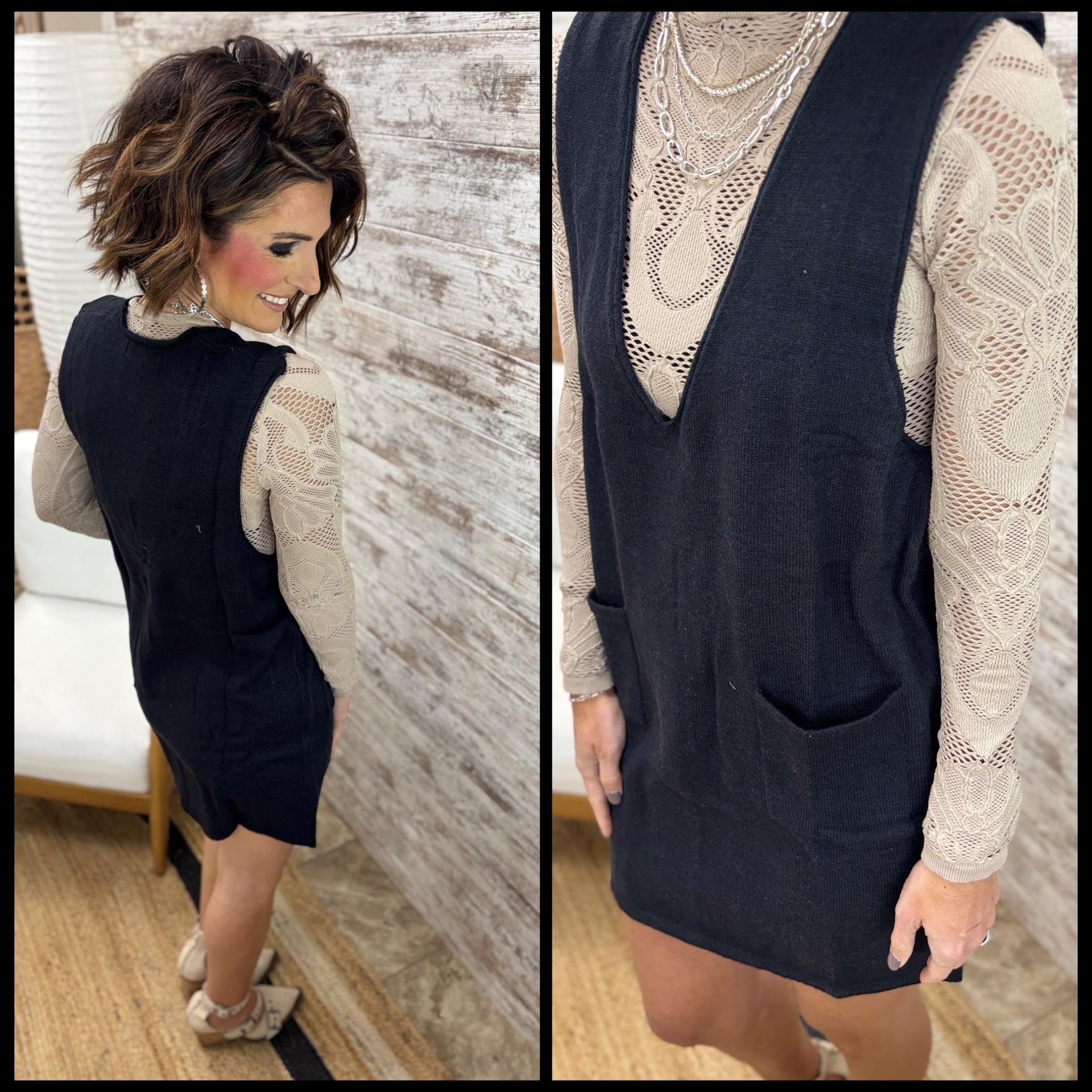 This sleeveless knit mini dress features a deep V-neckline and a relaxed, easy-to-style silhouette. Designed with clean finishing and front patch pockets, it pairs effortlessly with fitted tops or turtlenecks for a layered look. Perfect for fall and winter, its simple lines make it a versatile piece to style stylishly throughout the colder seasons.