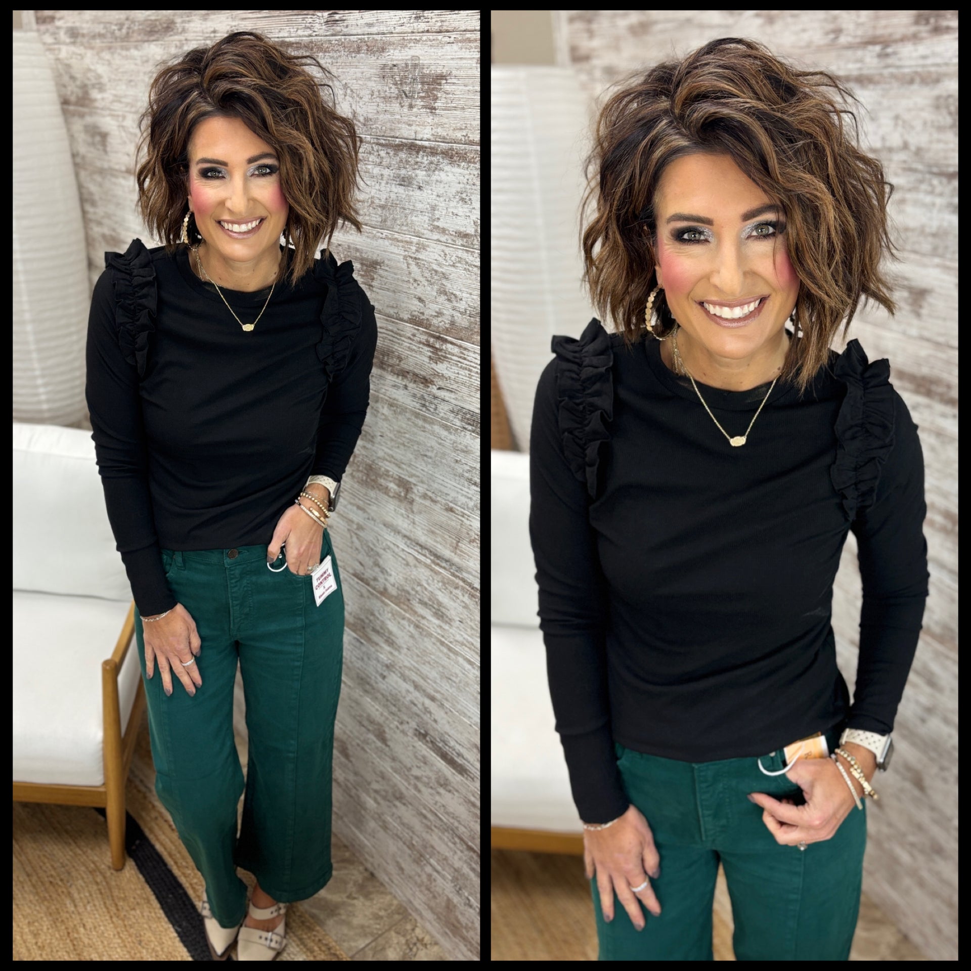 ROUND NECK FAUX SUEDE RUFFLE SHOULDER LONG SLEEVE TOP - Round neckline for a classic, versatile look - Statement faux suede ruffle details on both shoulders - Long sleeves provide comfortable coverage - Smooth, soft knit fabric for all-day wear