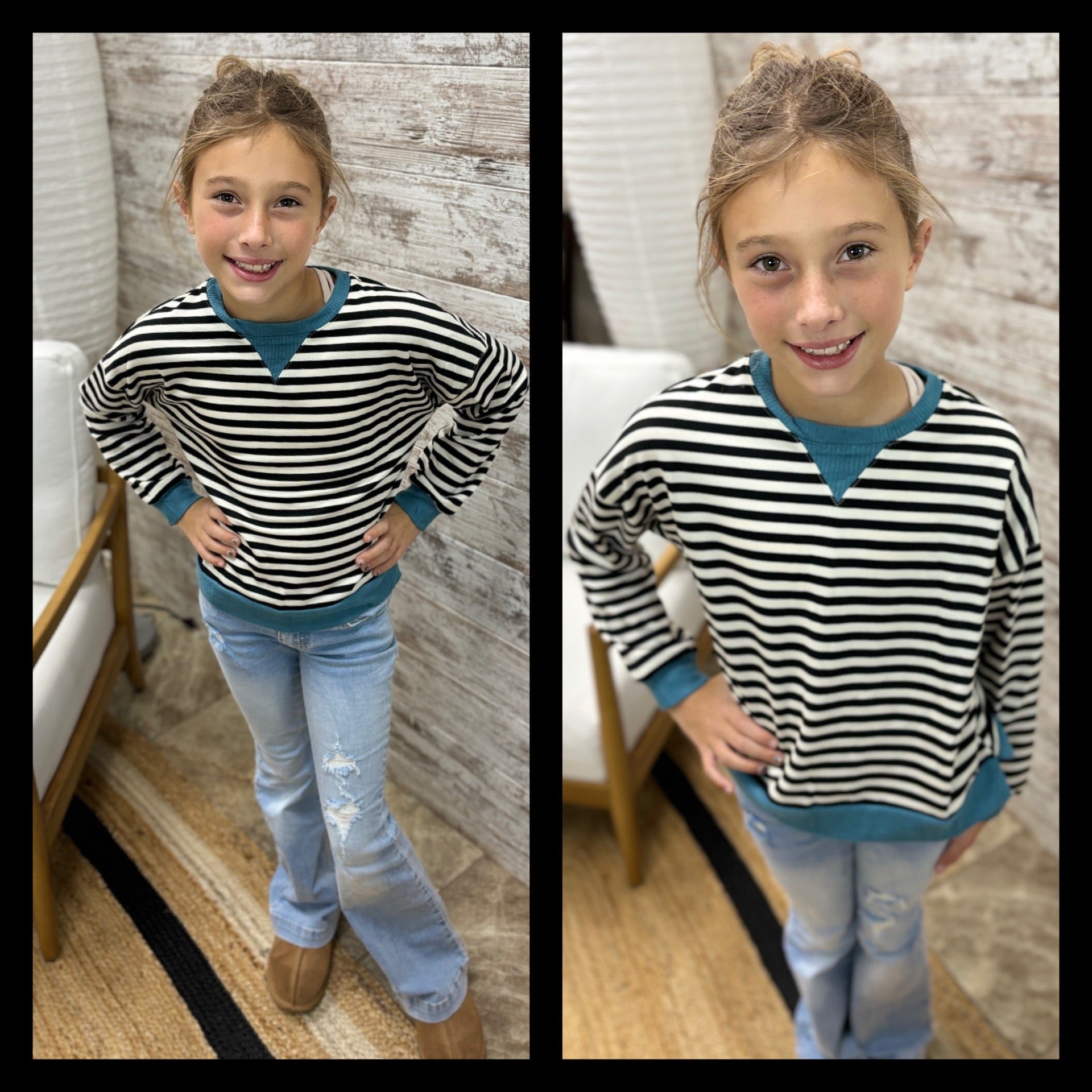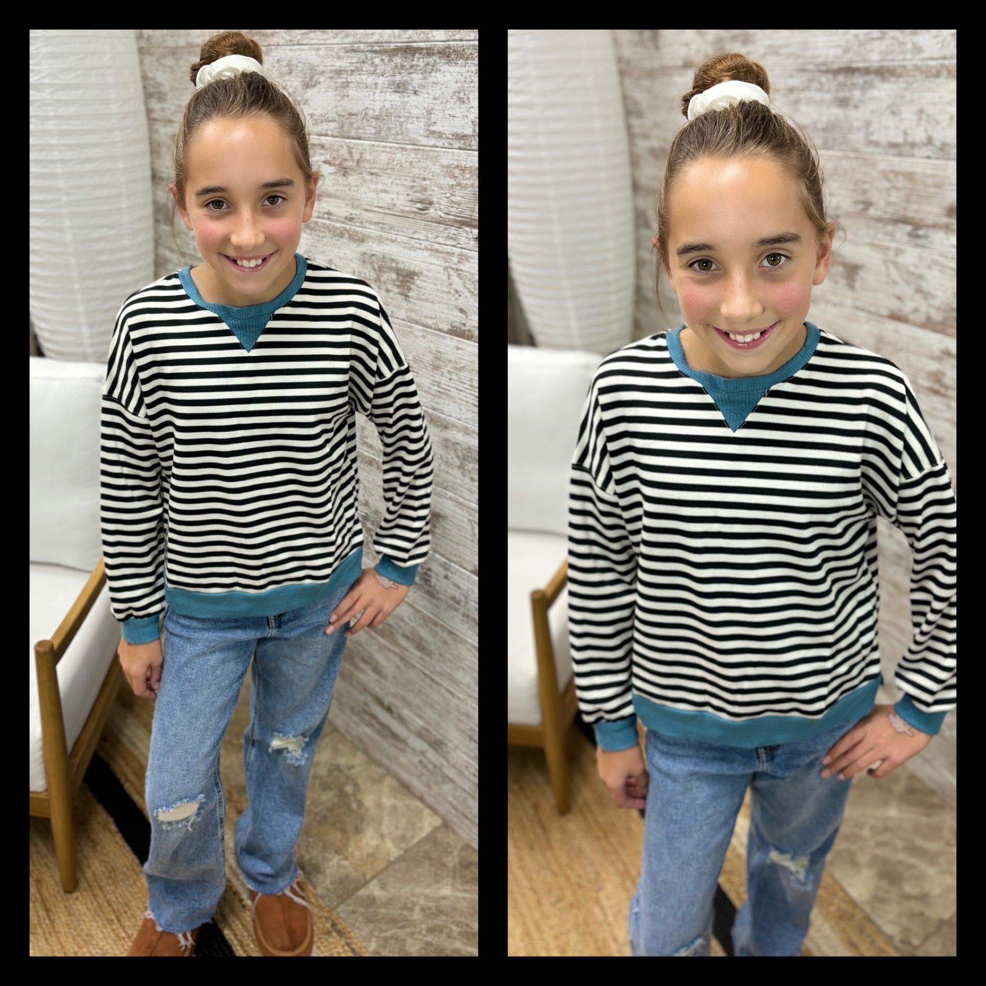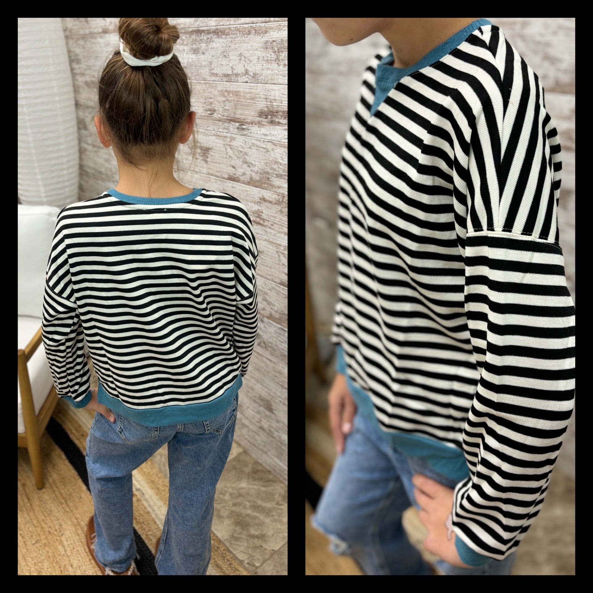 Girls Contrast Banded Detail Ribbed Stripe Top *Stripe Knit Fabric *Round Cut Neckline *Cuff Sleeve