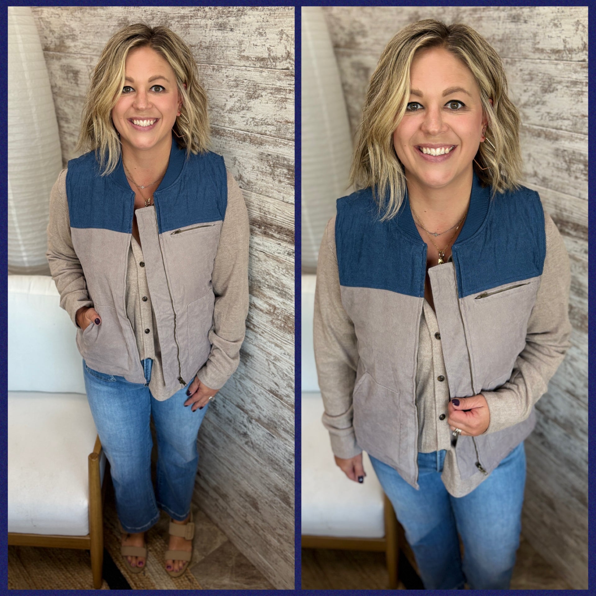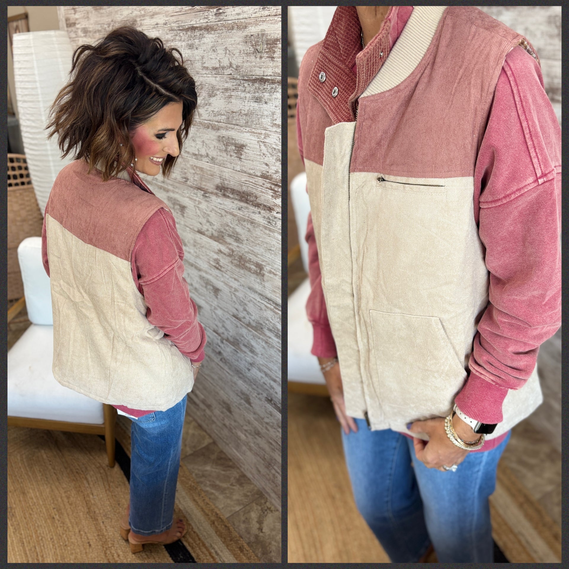 COLOR BLOCK CORDUROY MIXED PRINT LINING DETAIL VEST -ZIPPER FRONT -POCKETS -97%POLYESTER 3%SPANDEX