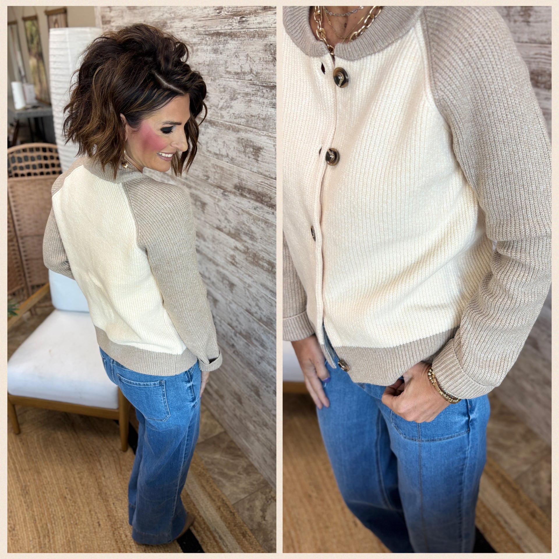 COLOR BLOCK SWEATER KNIT VARSITY CARDIGAN -74% ACRYLIC 22% POLYESTER 4% SPANDEX