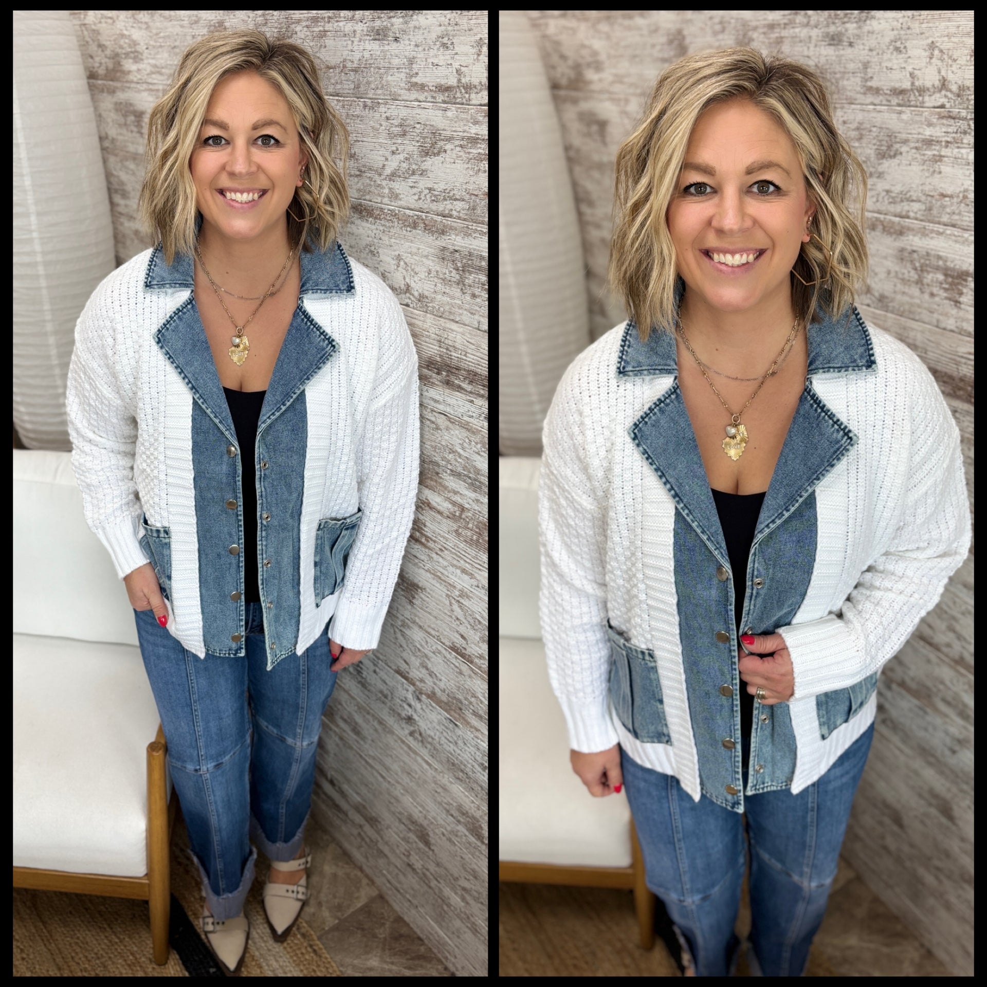 Denim and White Contrast Sweater Cardigan