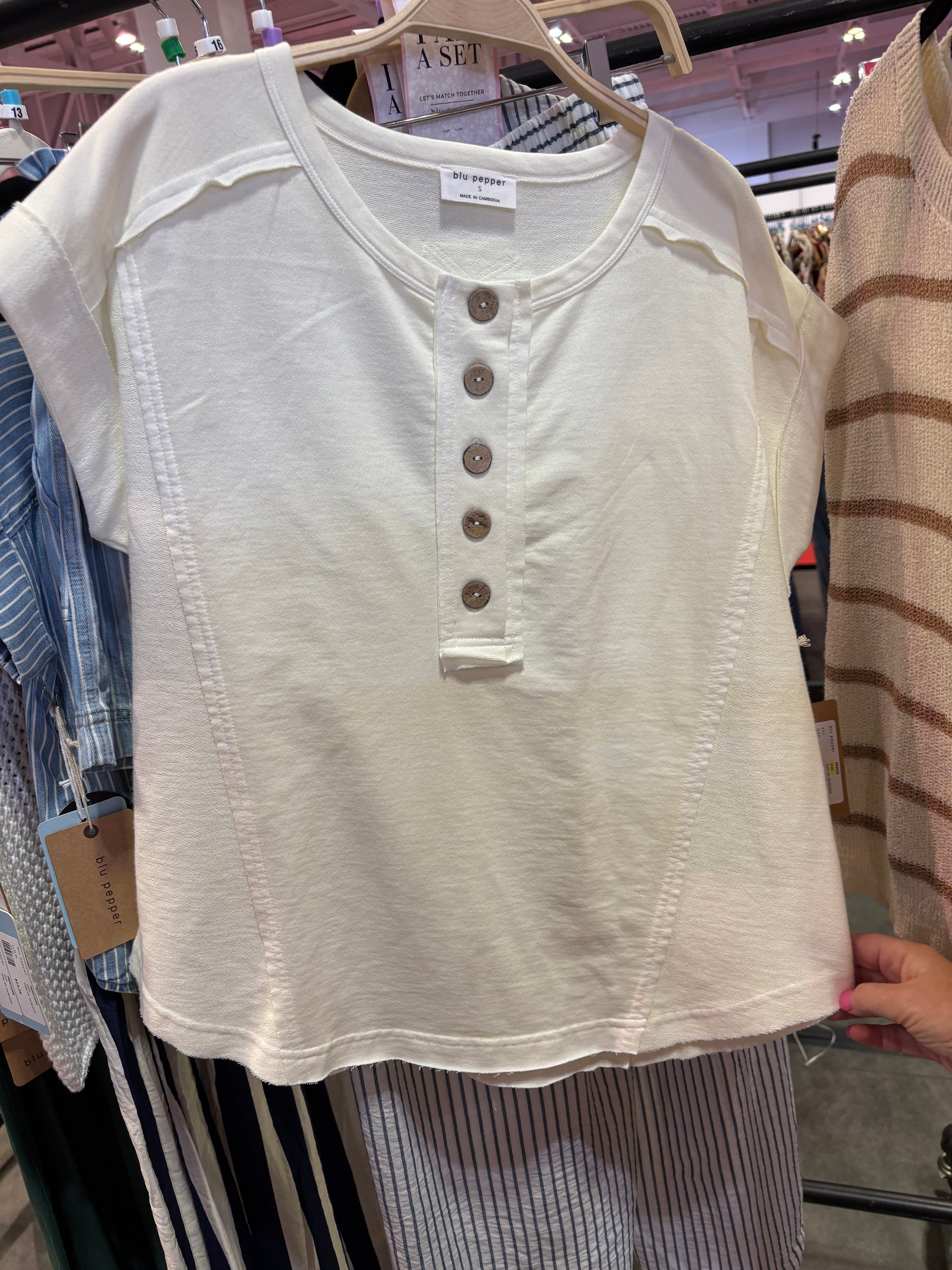 HENLEY NECKLINE HALF BUTTON DOWN SHORT SLEEVE EXTENDED SHOULDER EXPOSED SEAM DETAIL SOLID NOT LINED KNIT TOP 60% COTTON, 40% POLYESTER