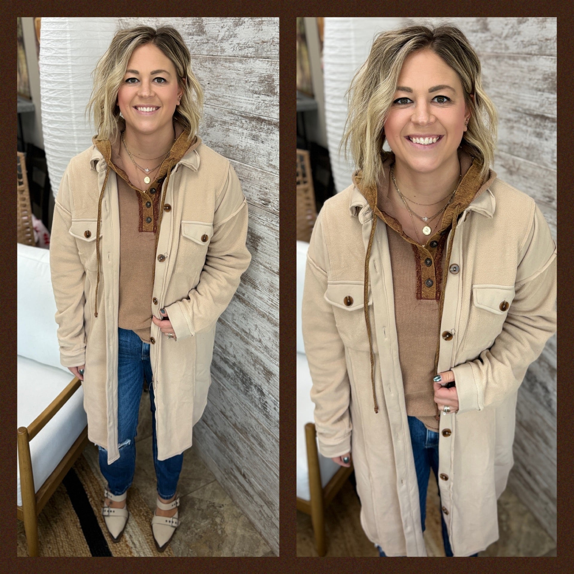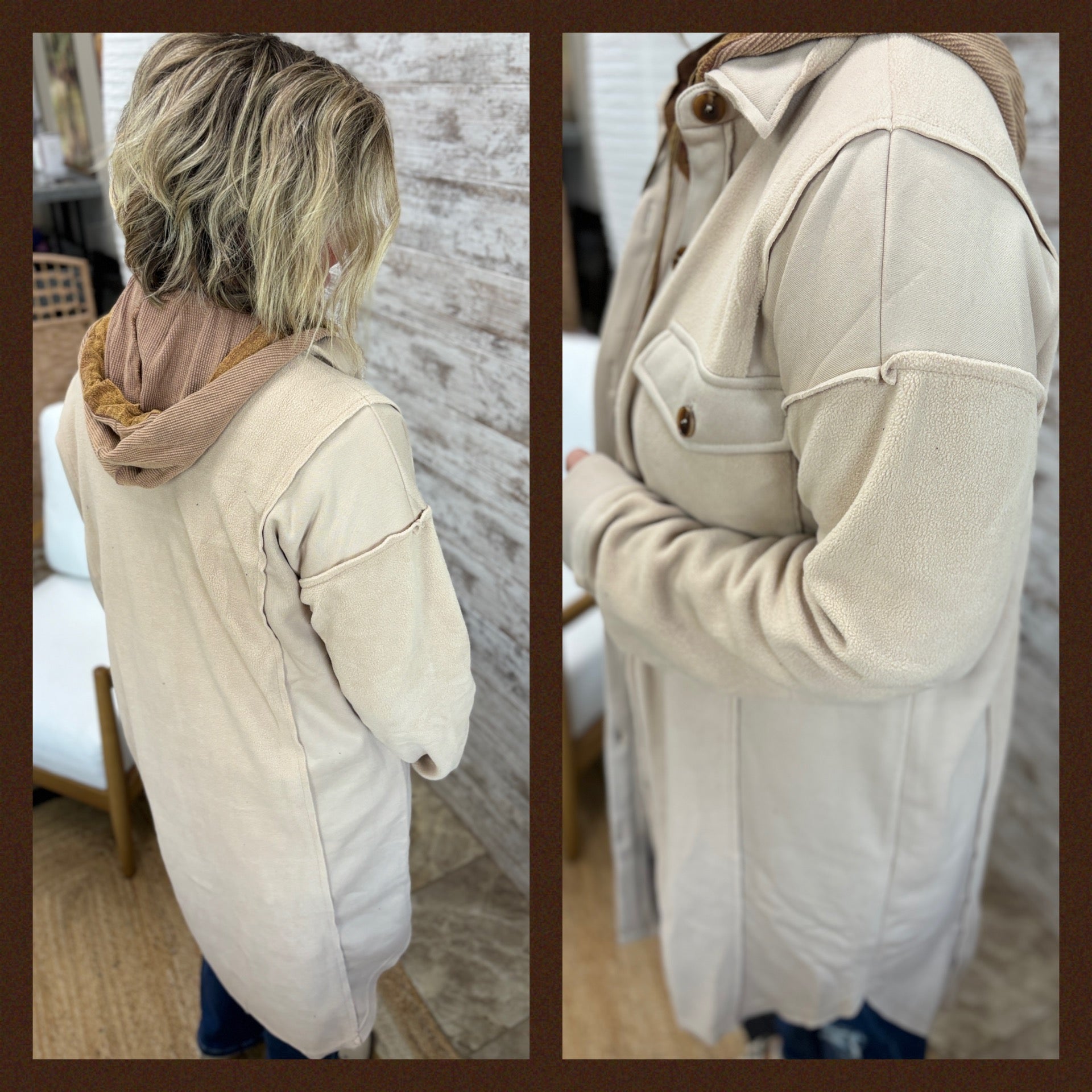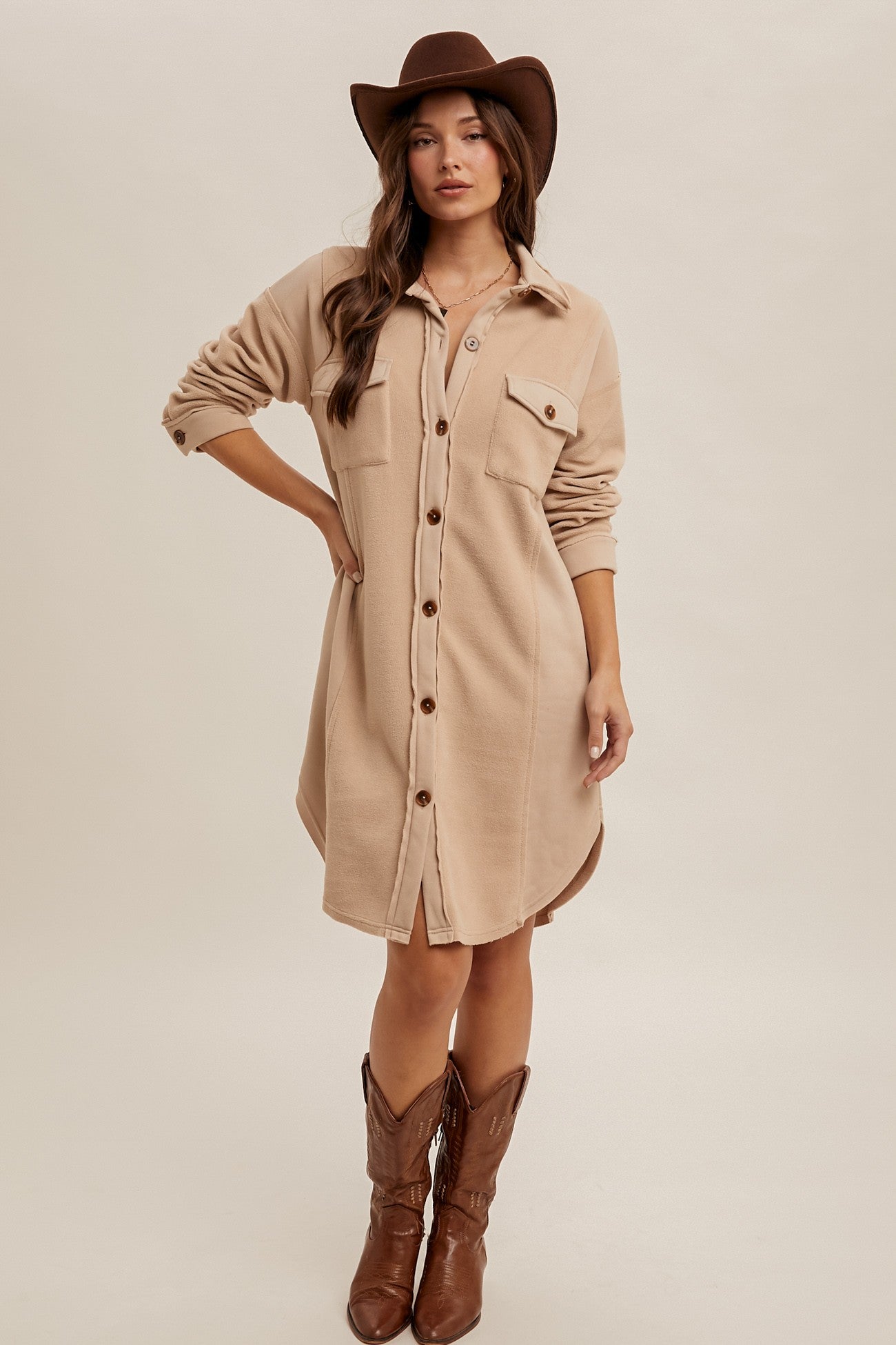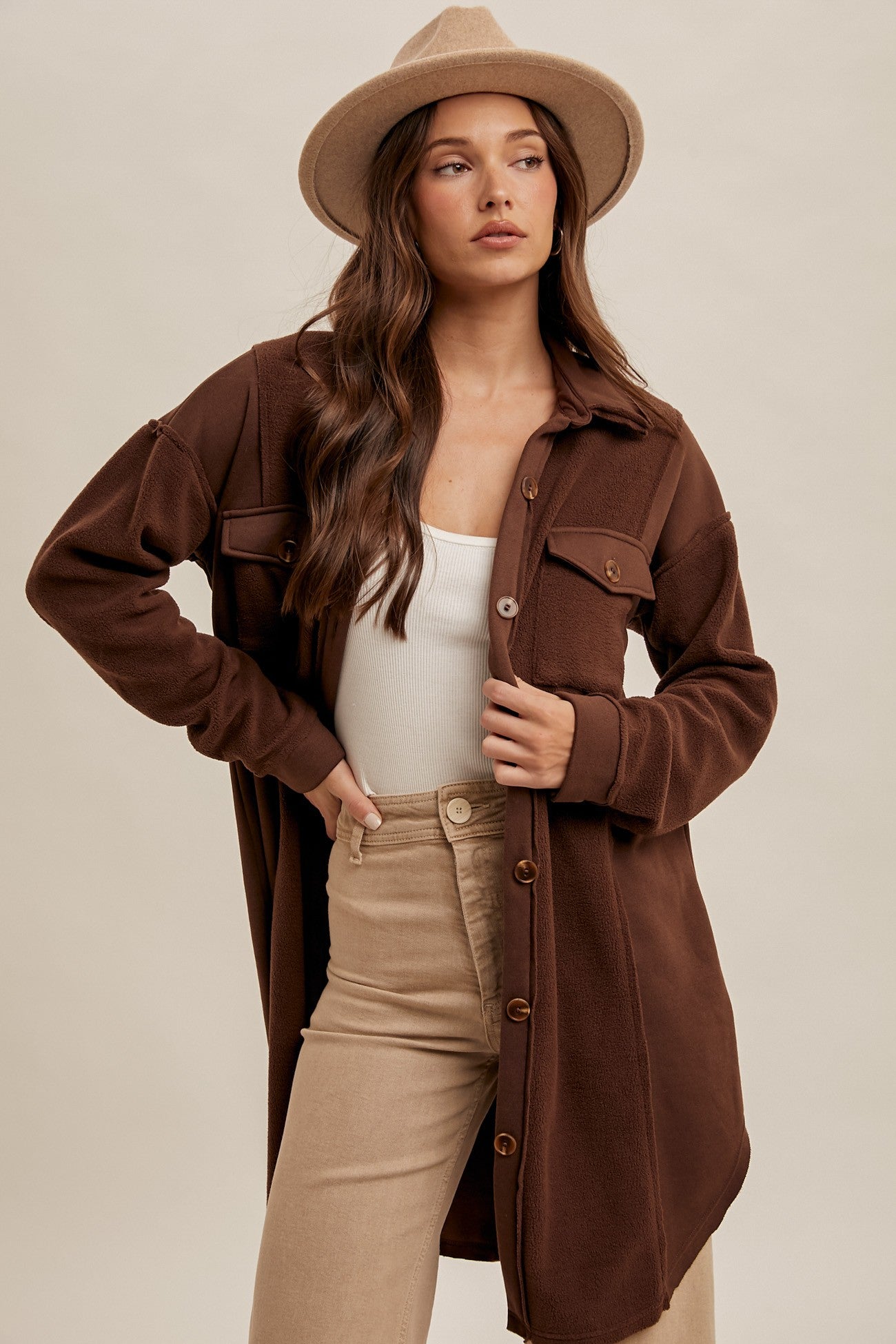 FLEECE CONTRAST LONGLINE BUTTON DOWN SHACKET -100% POLYESTER