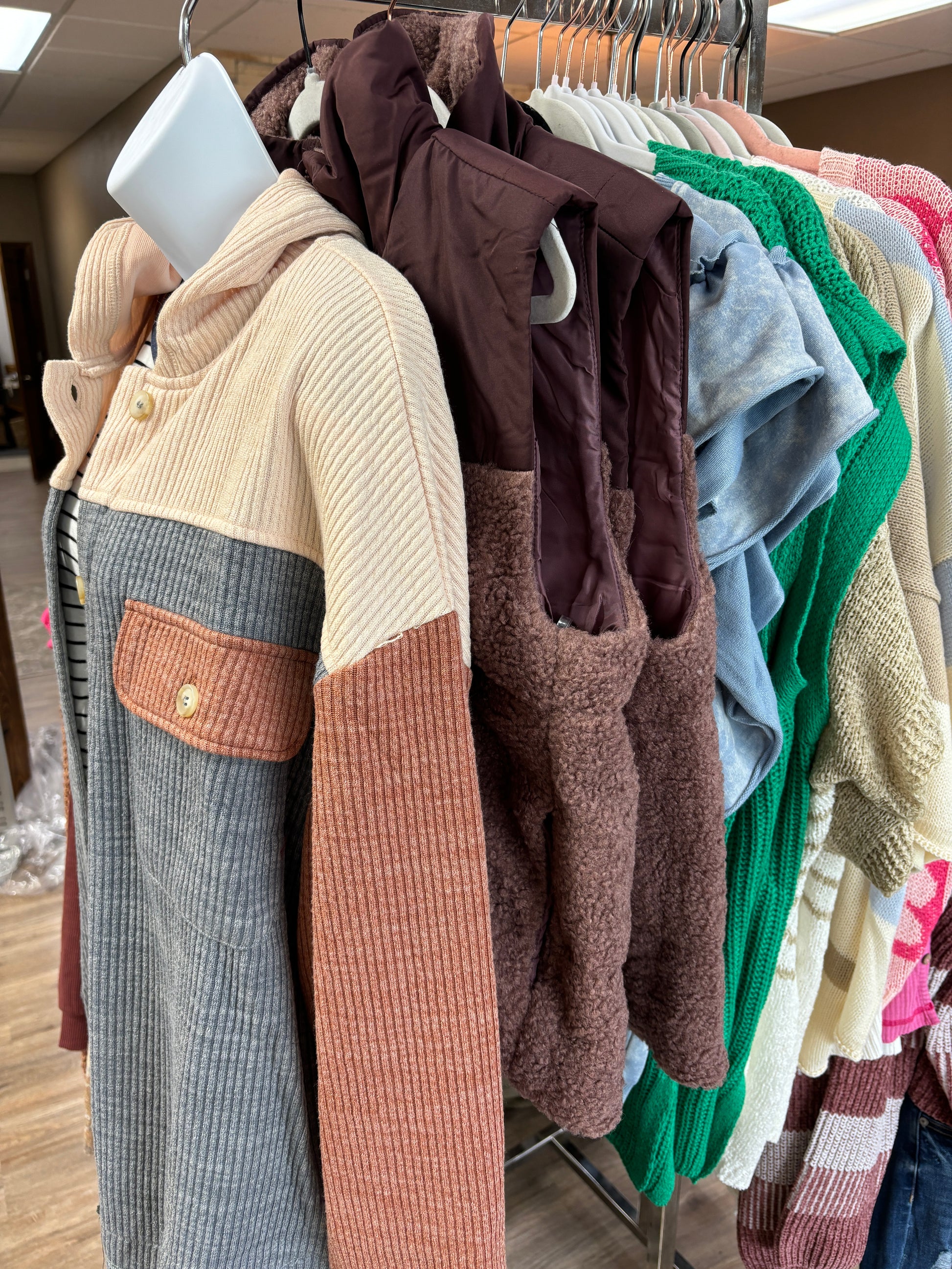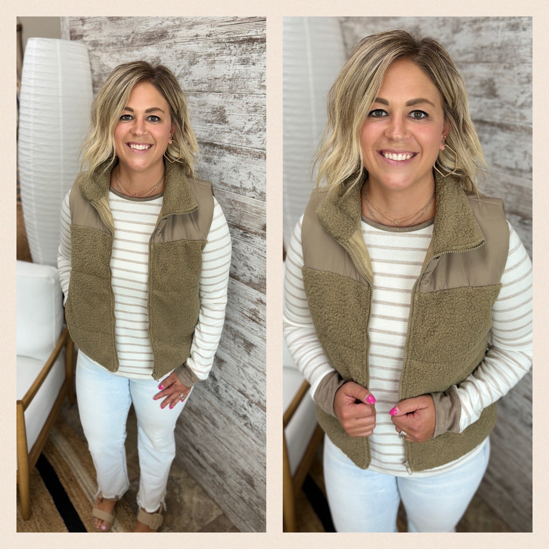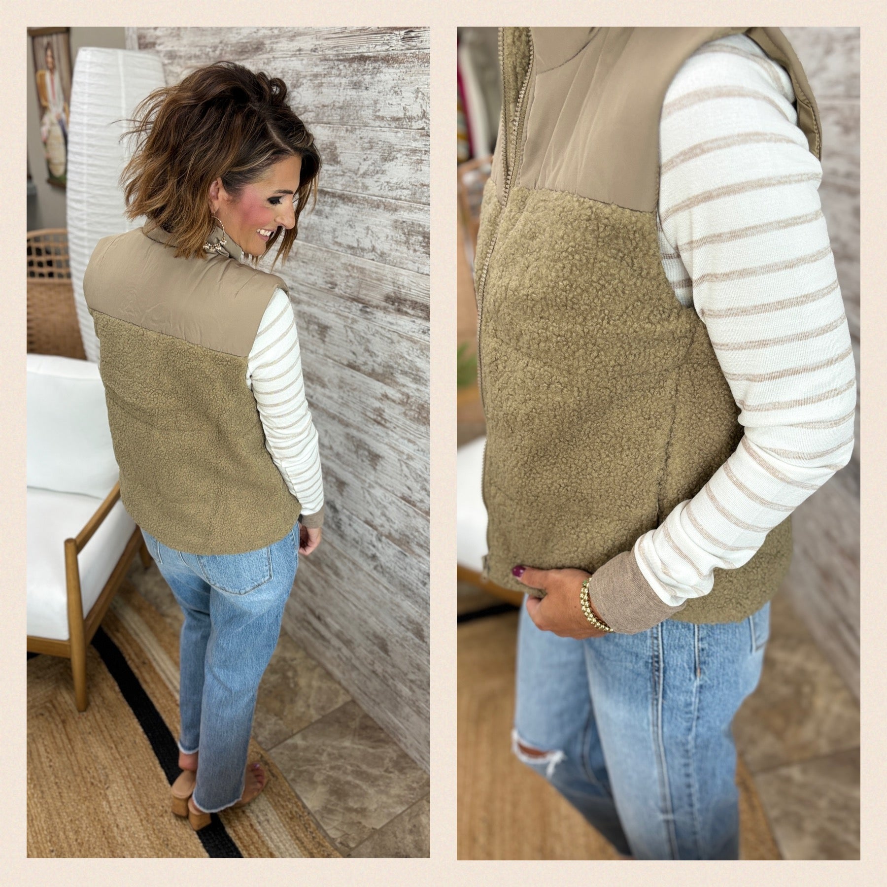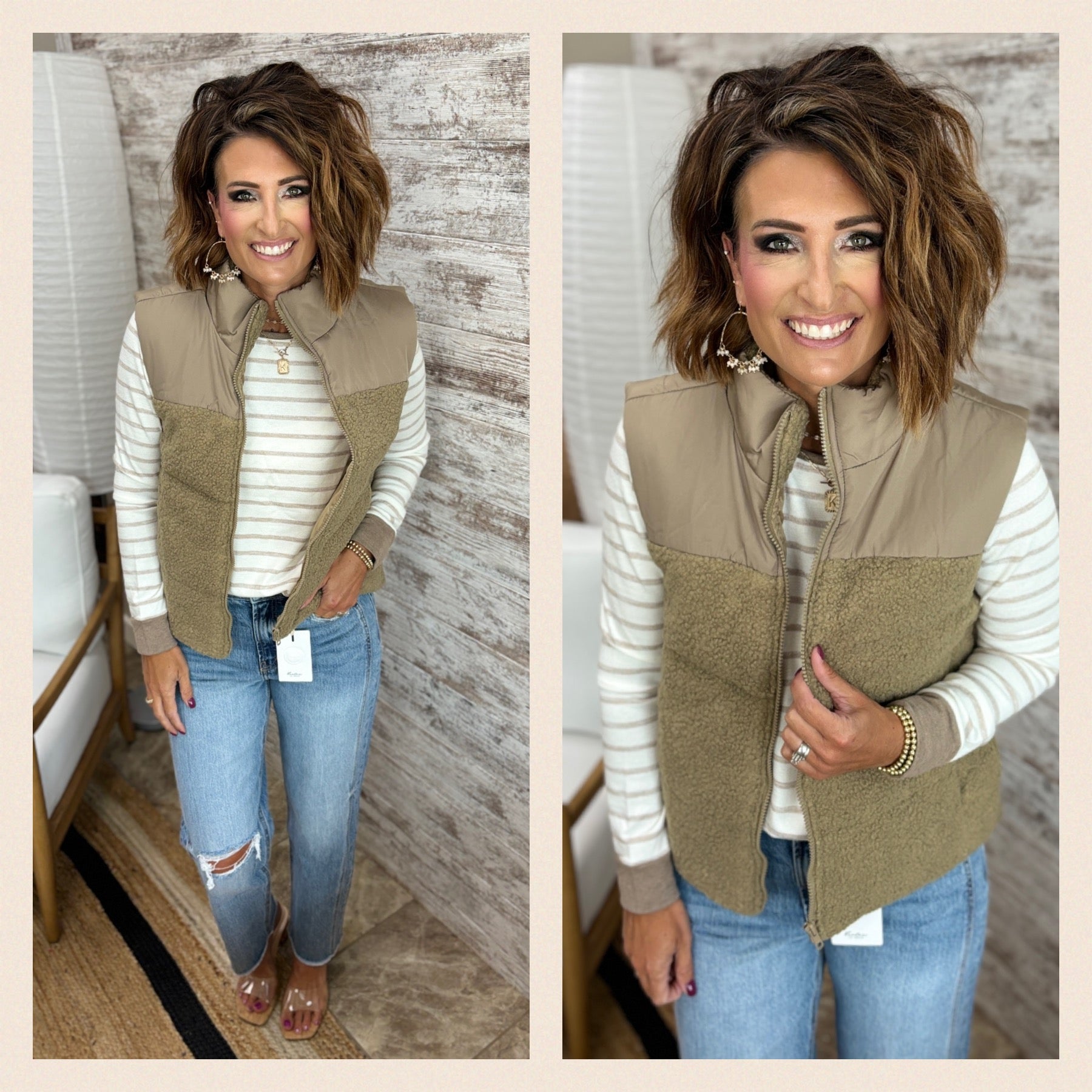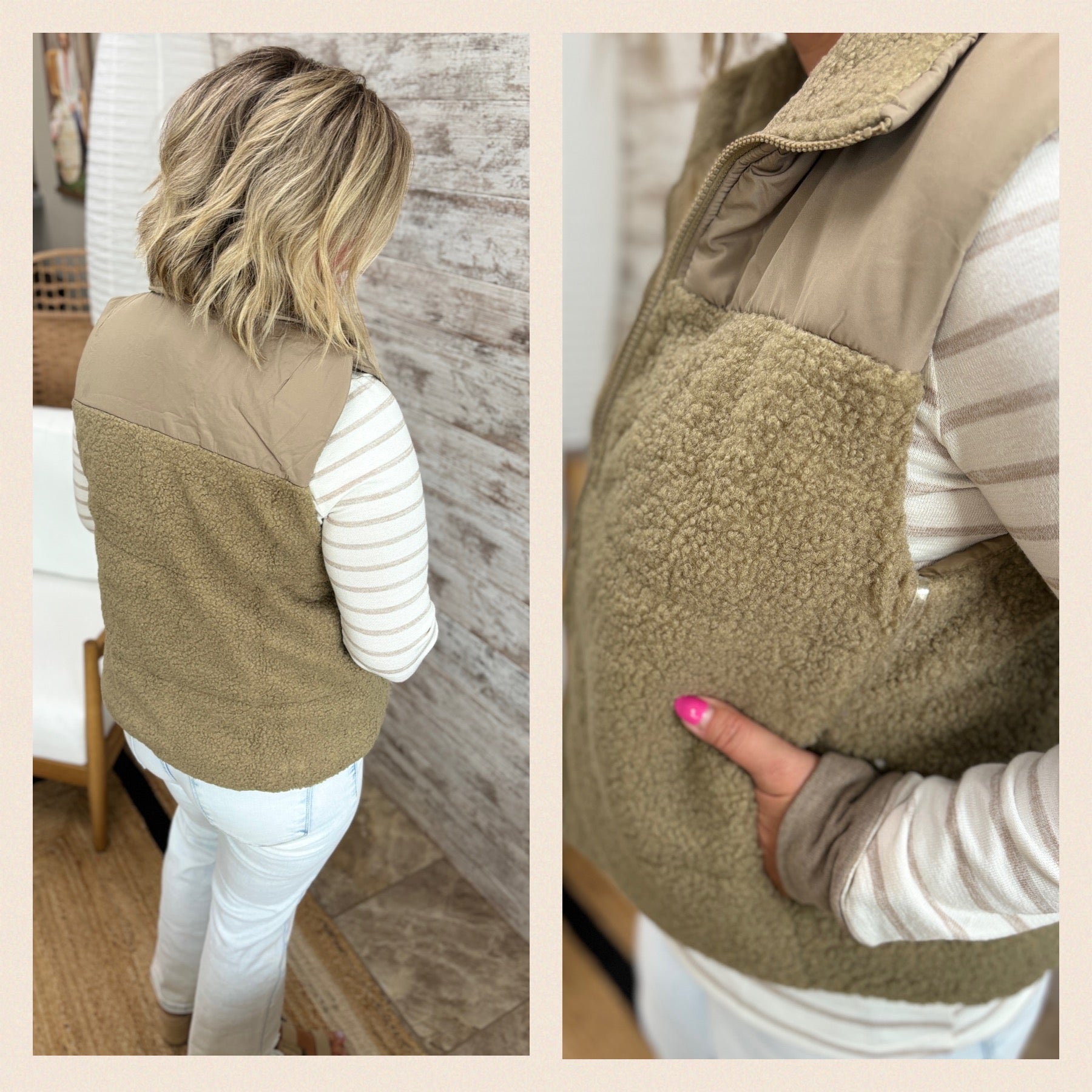 POLAR COLLAR, ZIP UP FRONT, DRAWSTRING HEM, PADDING, FLEECE VEST