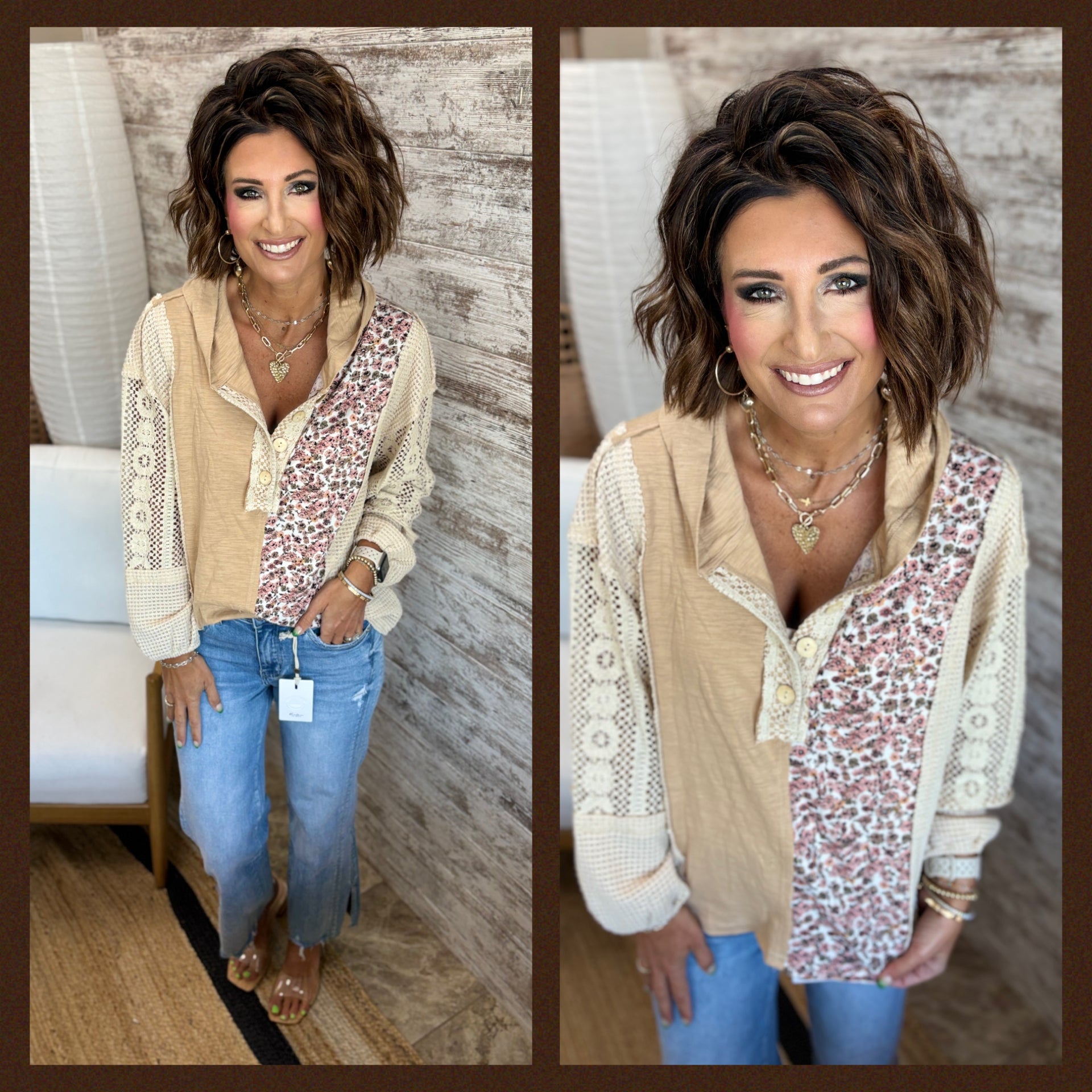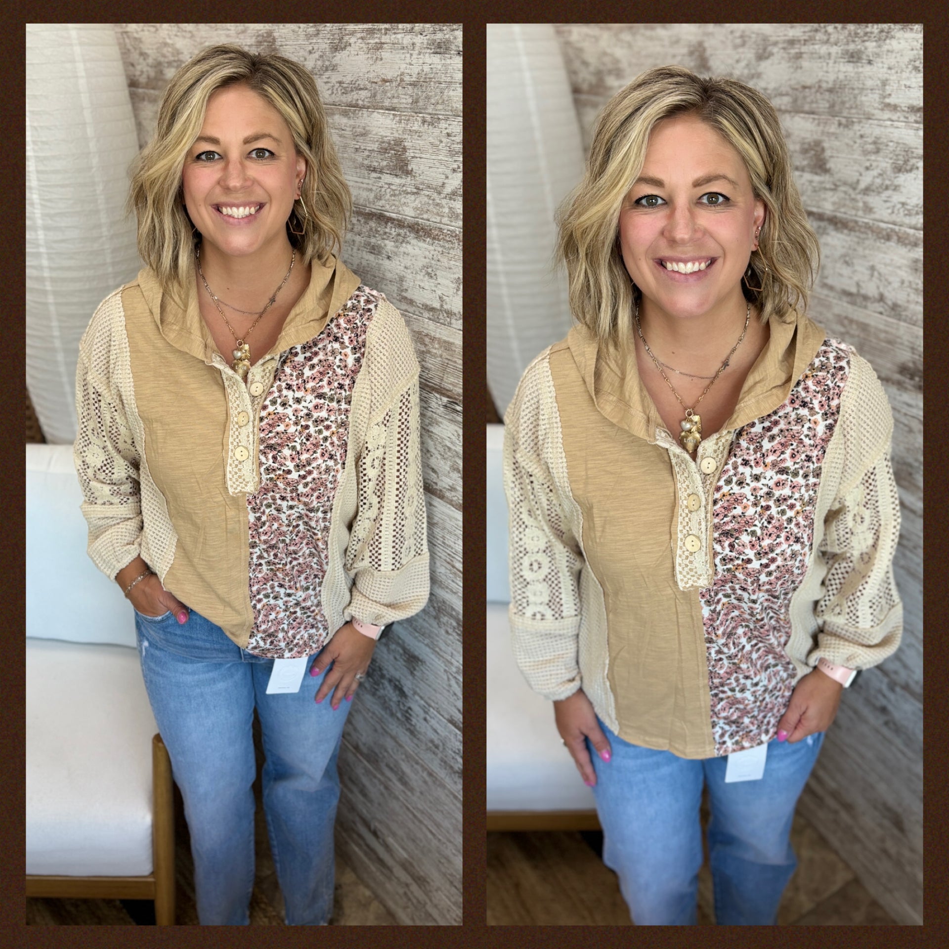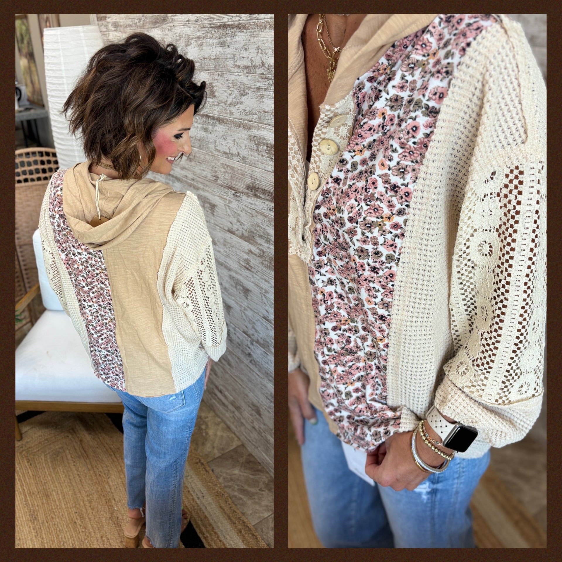 SLUB JERSEY WITH LACE COMBO BUTTONED HOODIE TOP