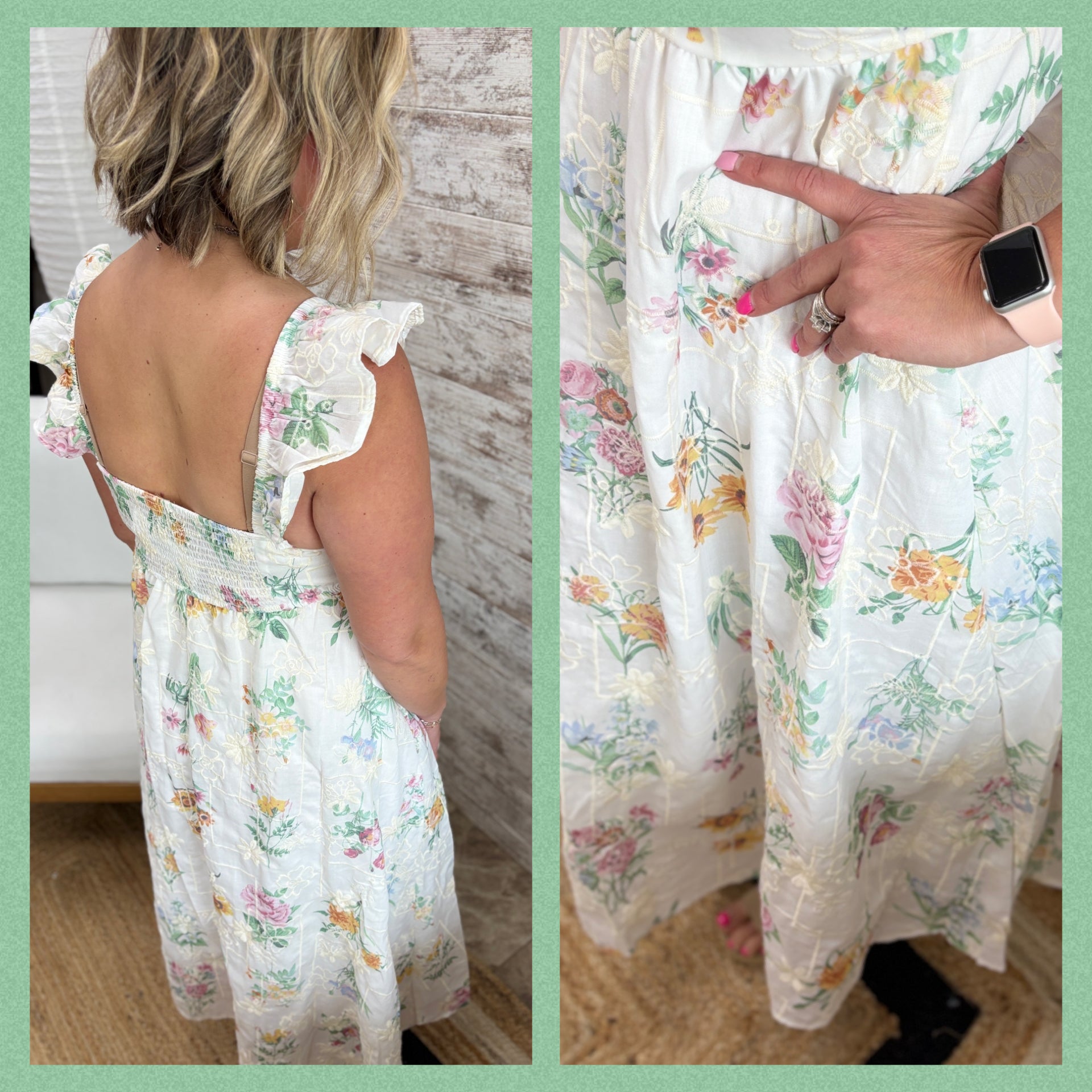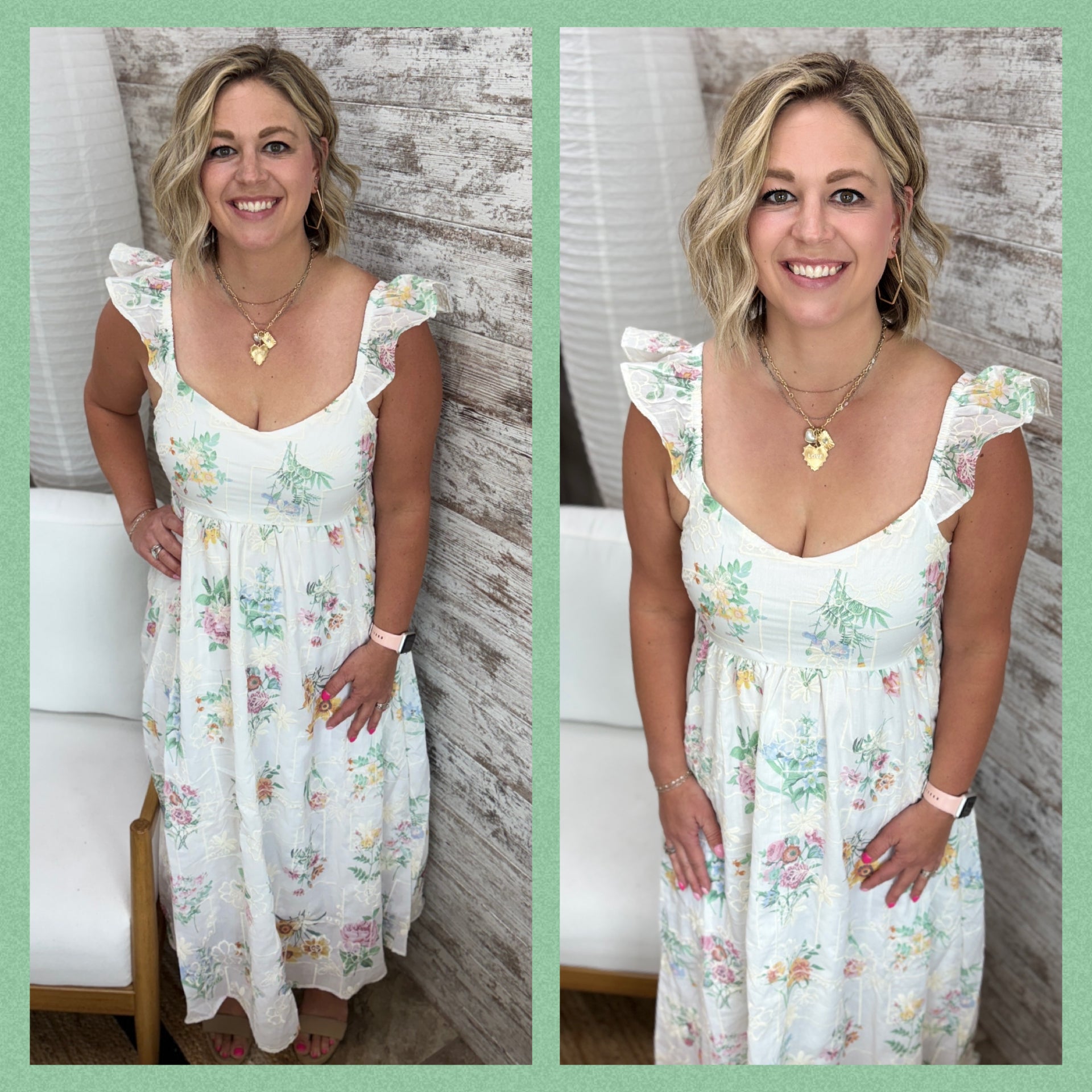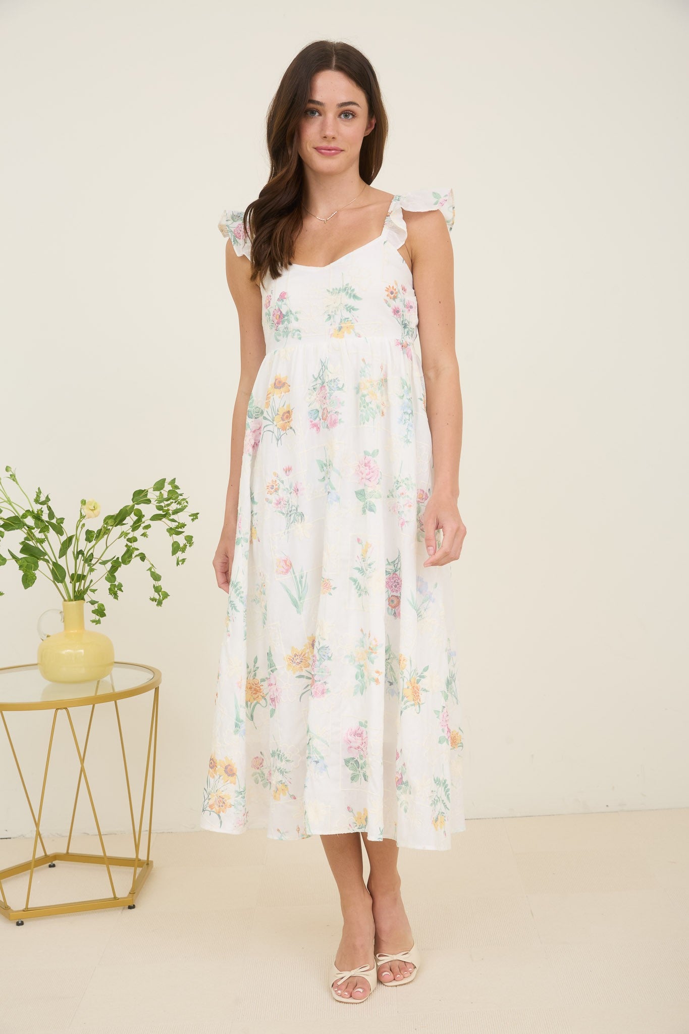 SWEETHEART NECKLINE ELASTIC RUFFLE STRAP ELASTIC WAIST & BACK TUNNEL A-LINE FLORAL PATTERN FLORAL EMBROIDERY DETAIL MIDI DRESS LINED SHELL: 100% POLYESTER LINING: 100% POLYESTER