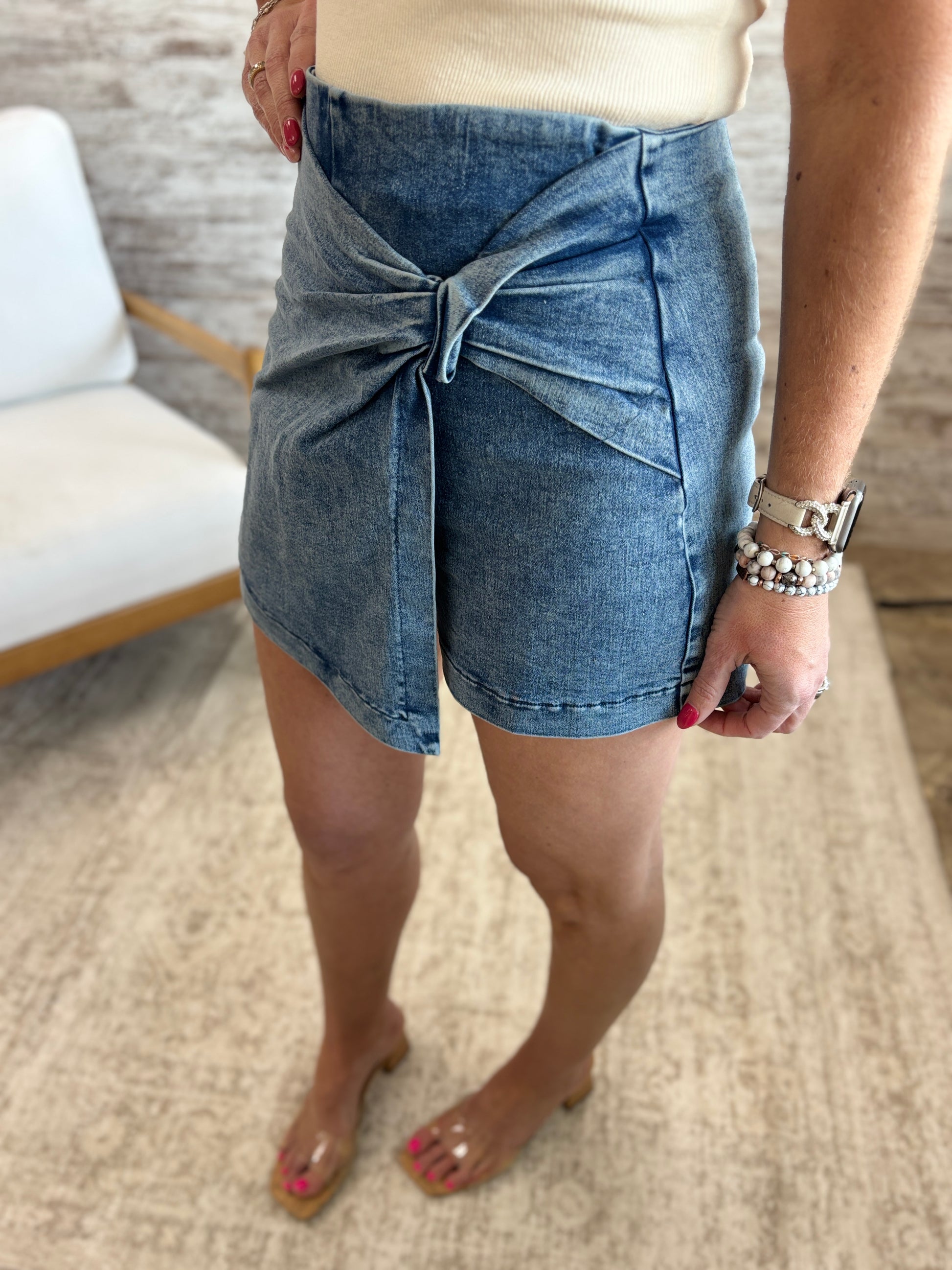 An acid wash skort featuring front cover detail and back zipper closure Details