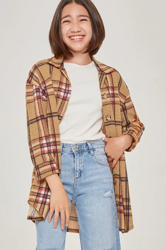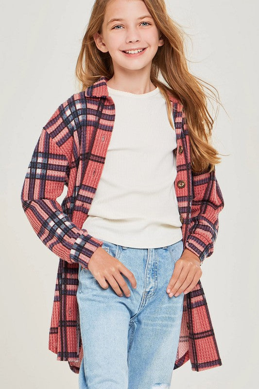 - Plaid print brushed waffle knit fabric - Fold-over collar and button placket - Long sleeves with ribbed cuffs - Dropped shoulders