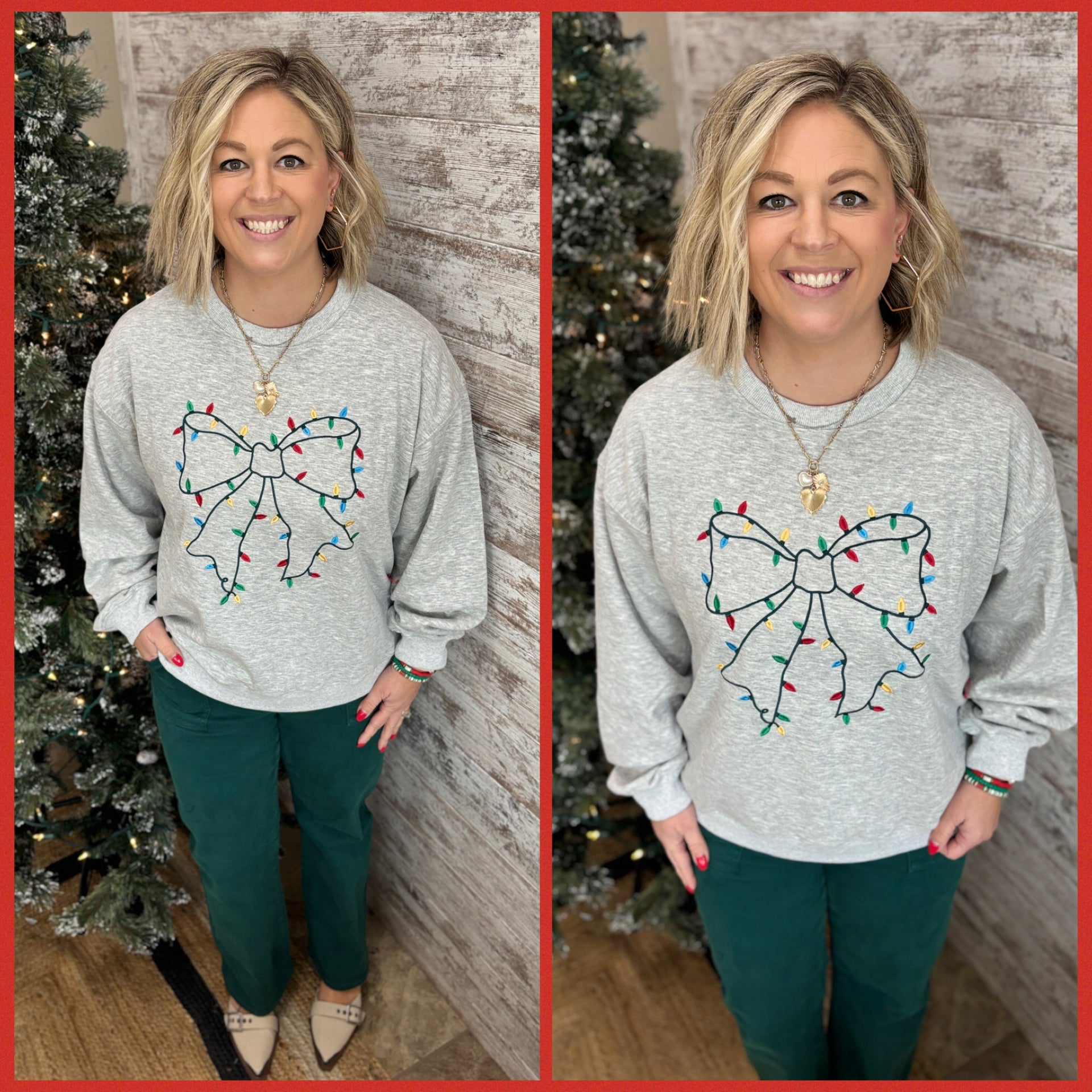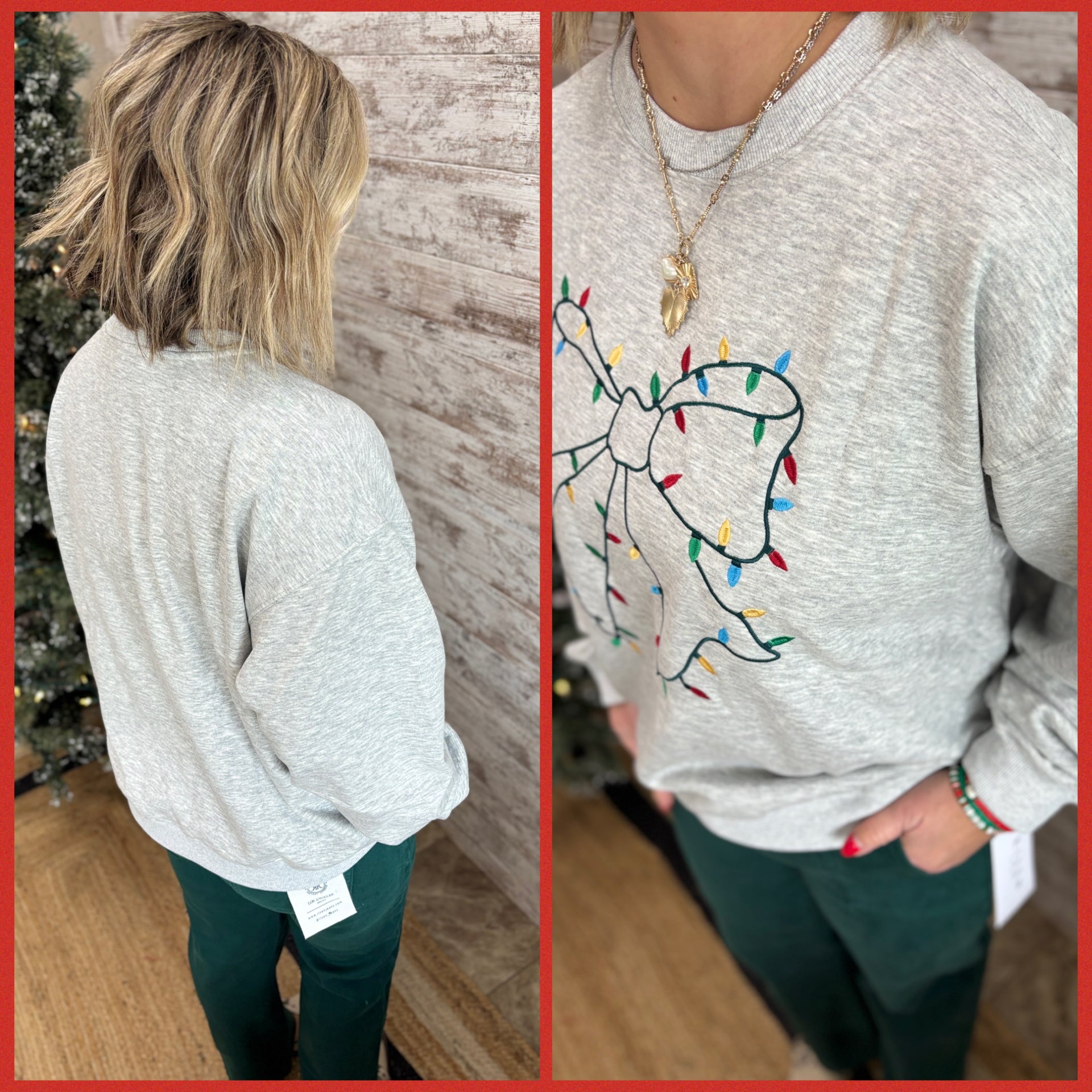 Add a touch of holiday sparkle with this soft fleece sweatshirt featuring a festive embroidered bow wrapped in colorful Christmas lights. Cozy yet playful, it’s perfect for gifting, family gatherings, or boutique holiday displays. Pairs easily with plaid or lounge sets.