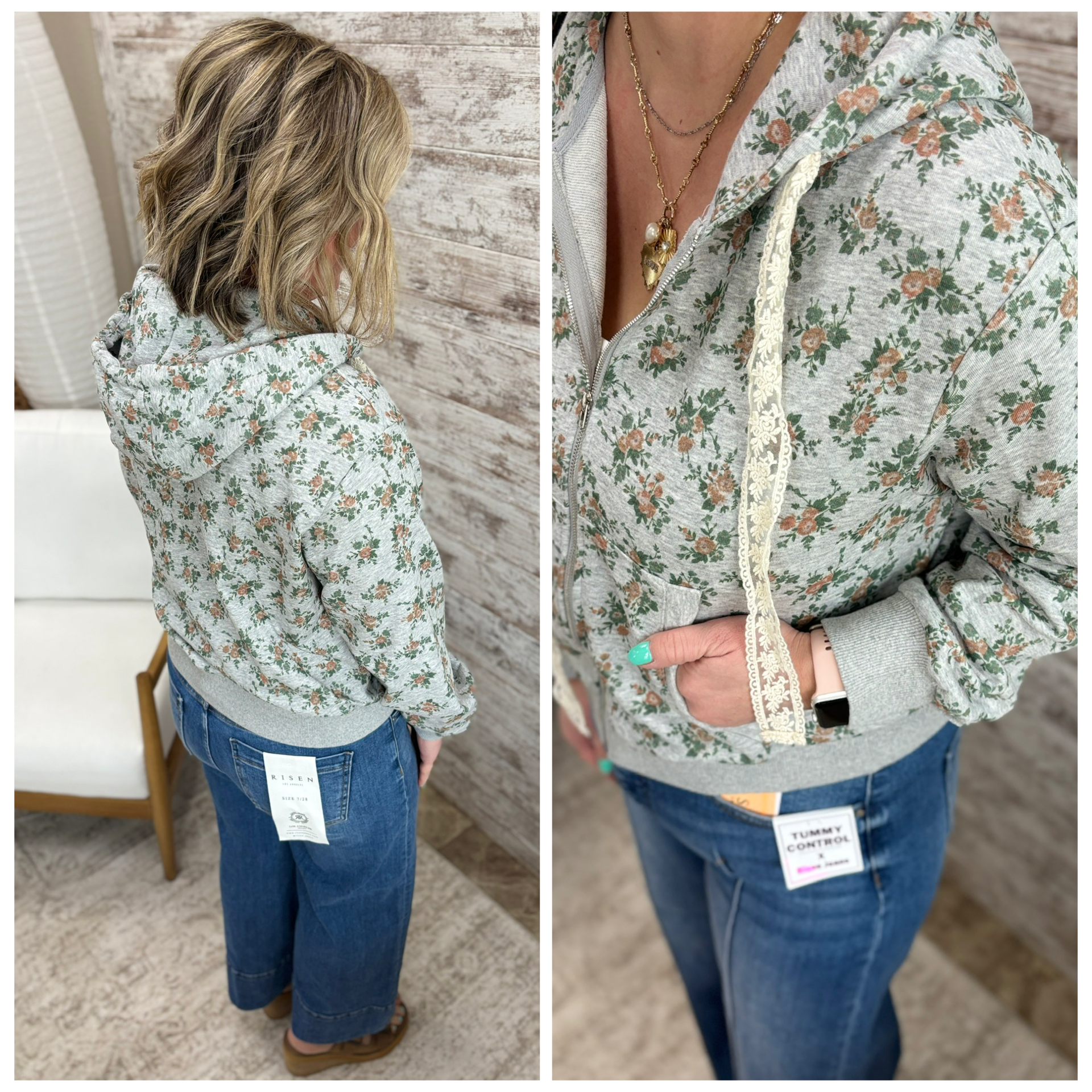 FLORAL PRINTED TERRY HOODIE ZIP UP TOP SELF 60%COTTON 40%POLYESTER CONT1 60%COTTON 40%POLYESTER CONT2 75%COTTON 15%POLYESTER 10%SPANDEX