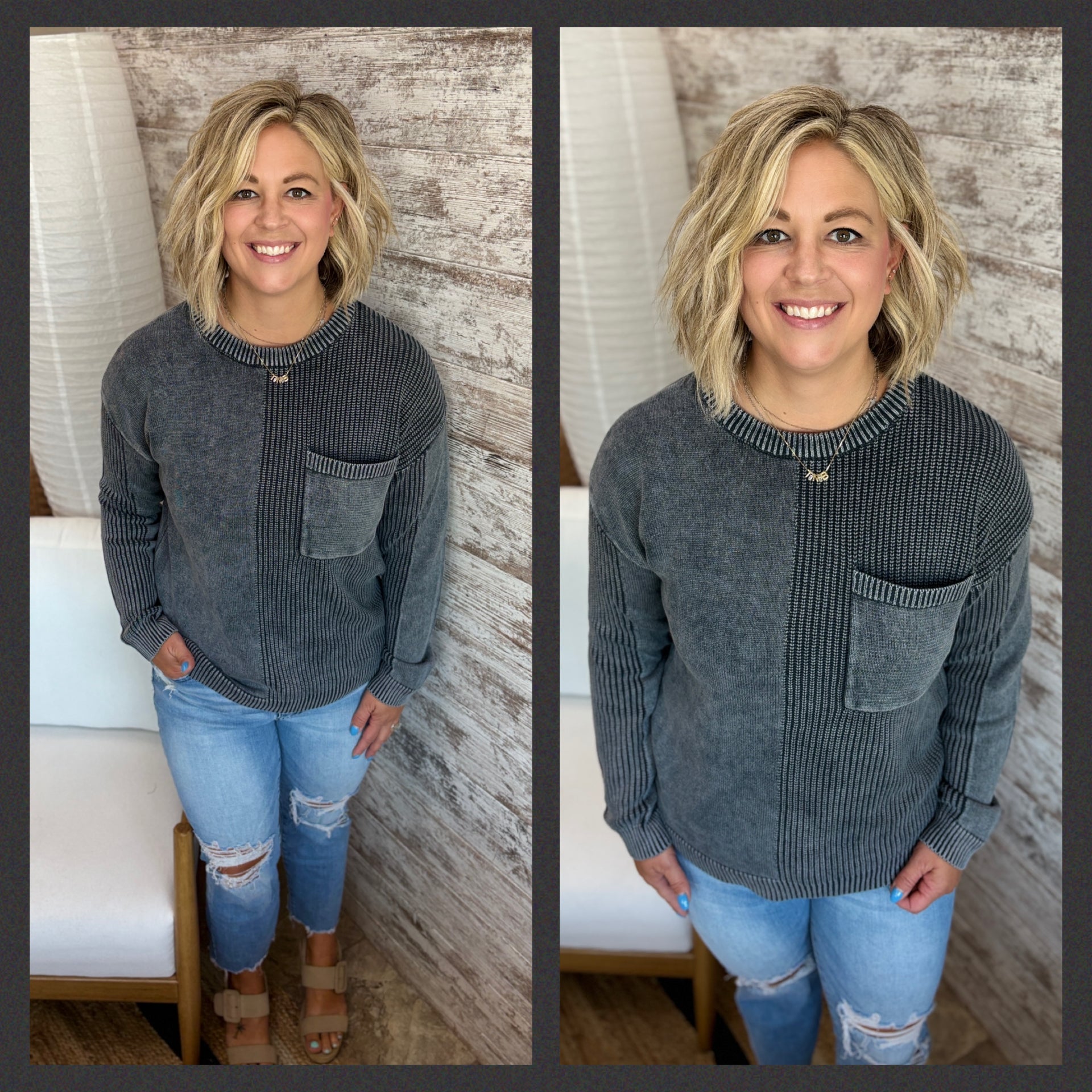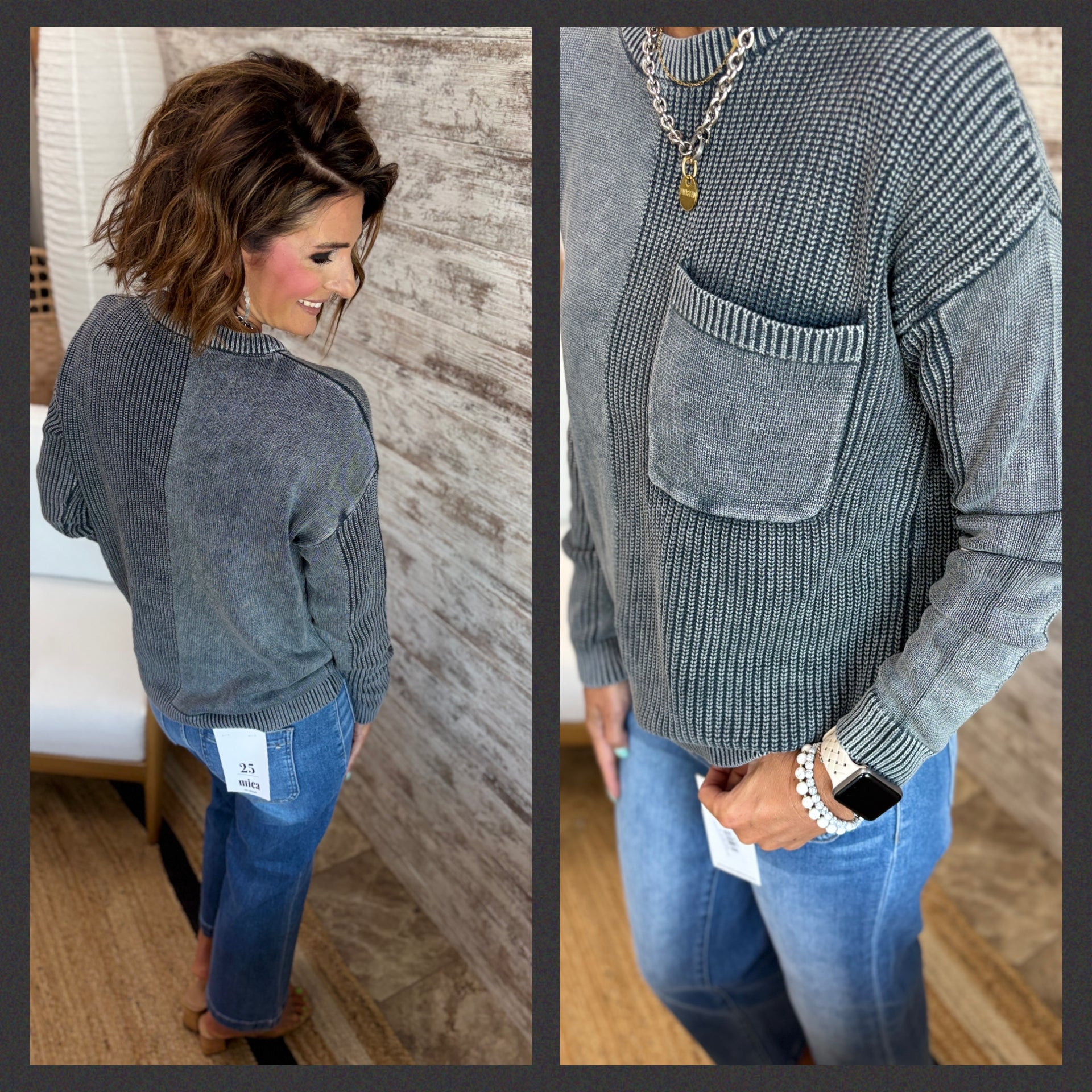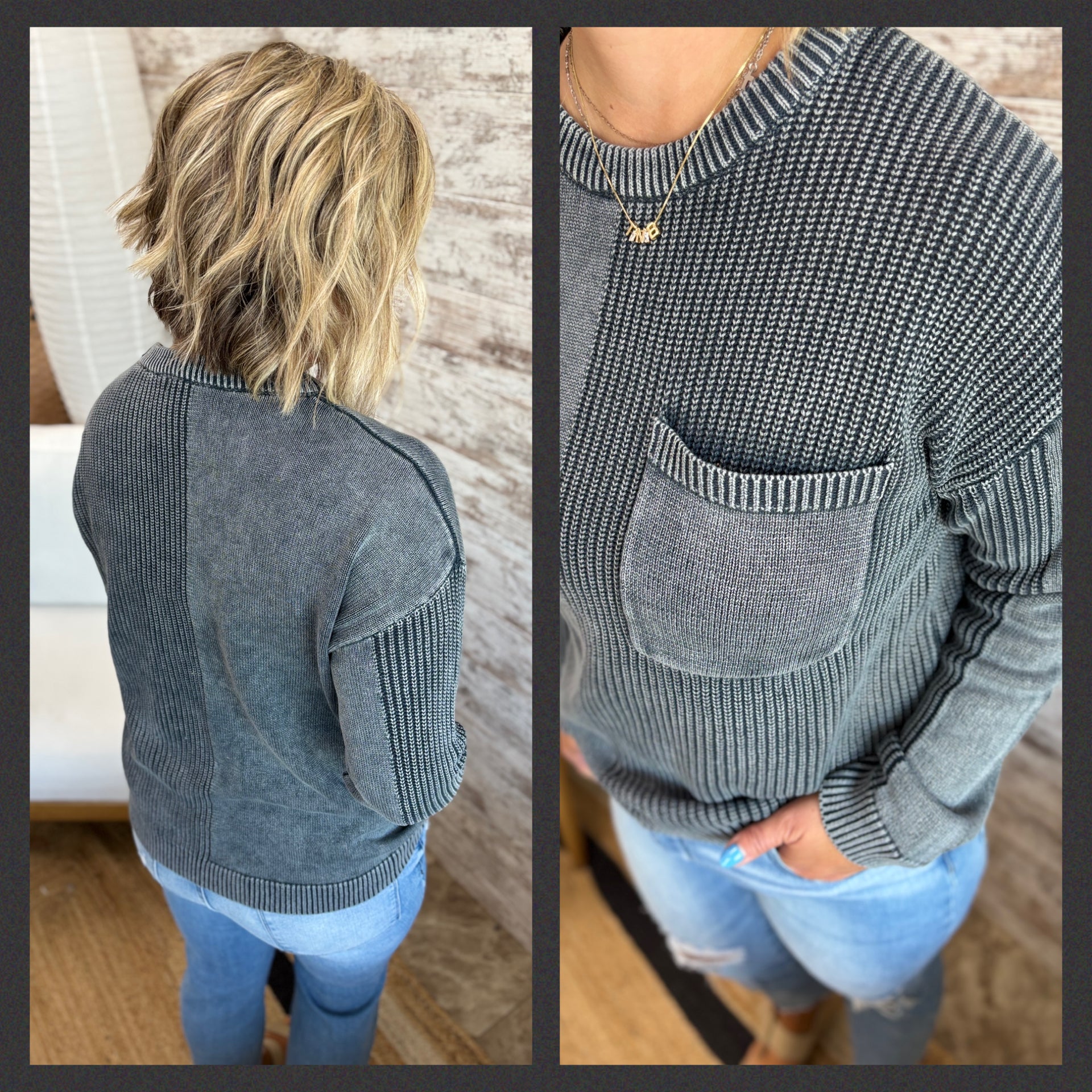 WASHED YARN, TEXTURED DETAIL, CHEST POCKET, CREW NECK, LONG SLEEVE, PULLOVER SWEATER
