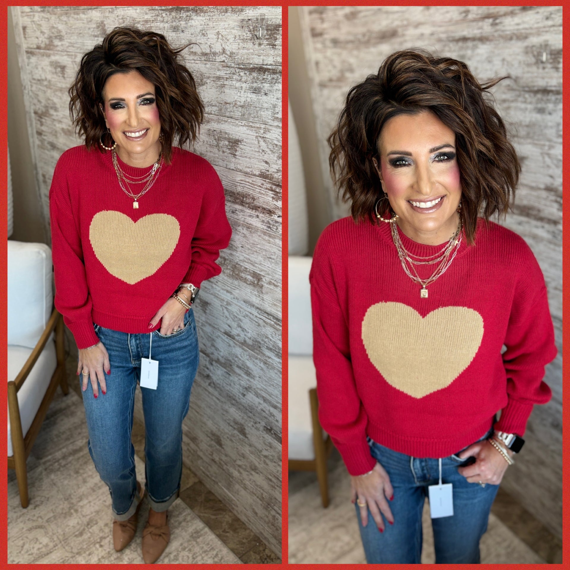 Round neck Crew neck Long sleeves Drop shoulder Relaxed fit Heart jacquard Knit pullover sweater