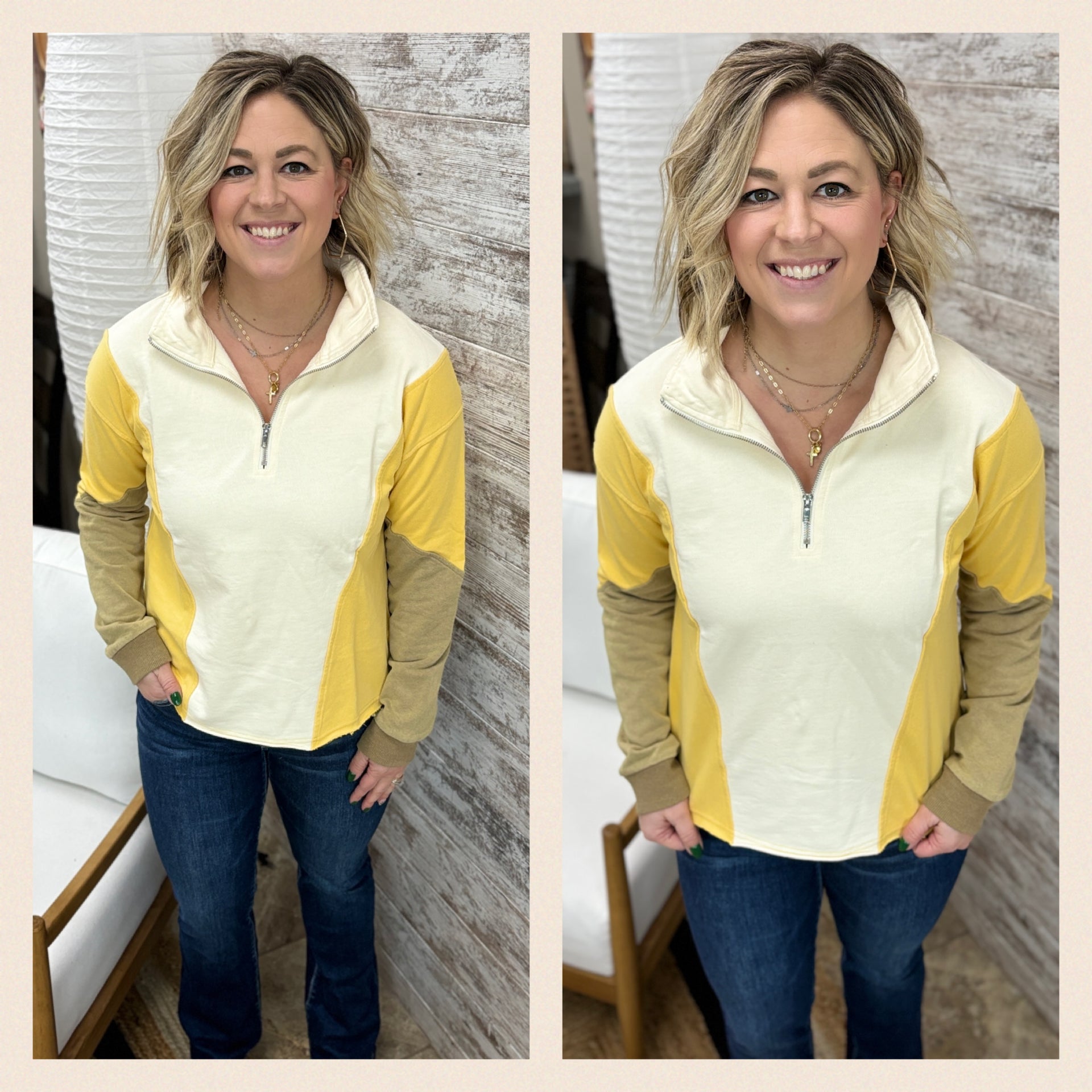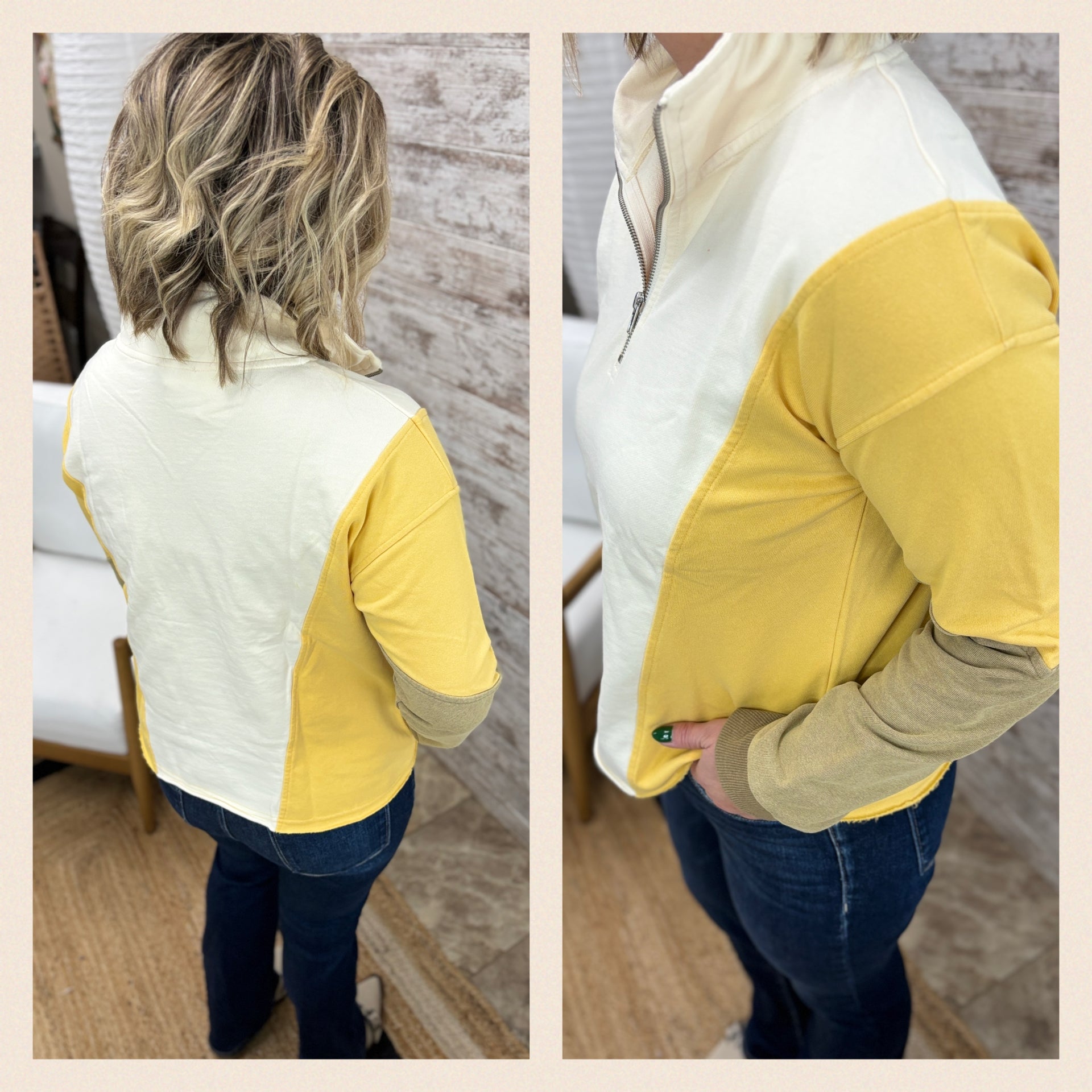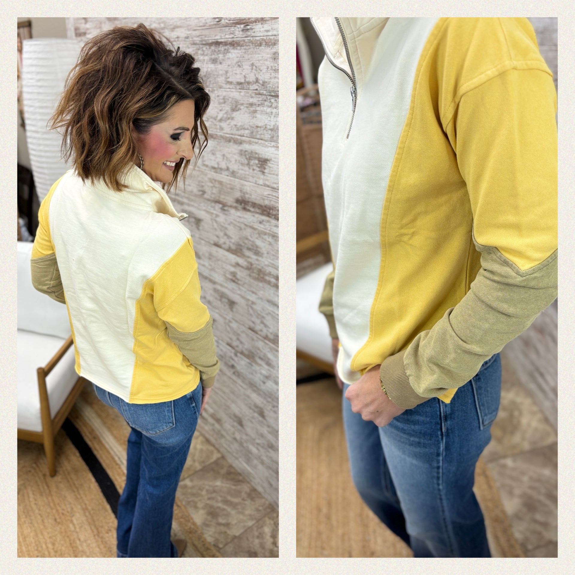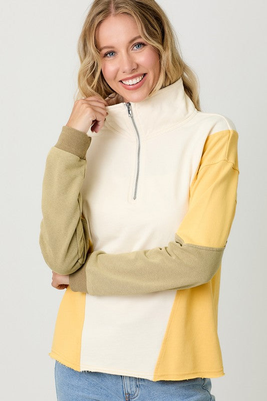 Garment Wash Color Block Top Mock neck Half front zipper closure Frayed hem -Self & Contrast-1 100% Cotton / Contrast-2 94% Cotton, 6% Spandex