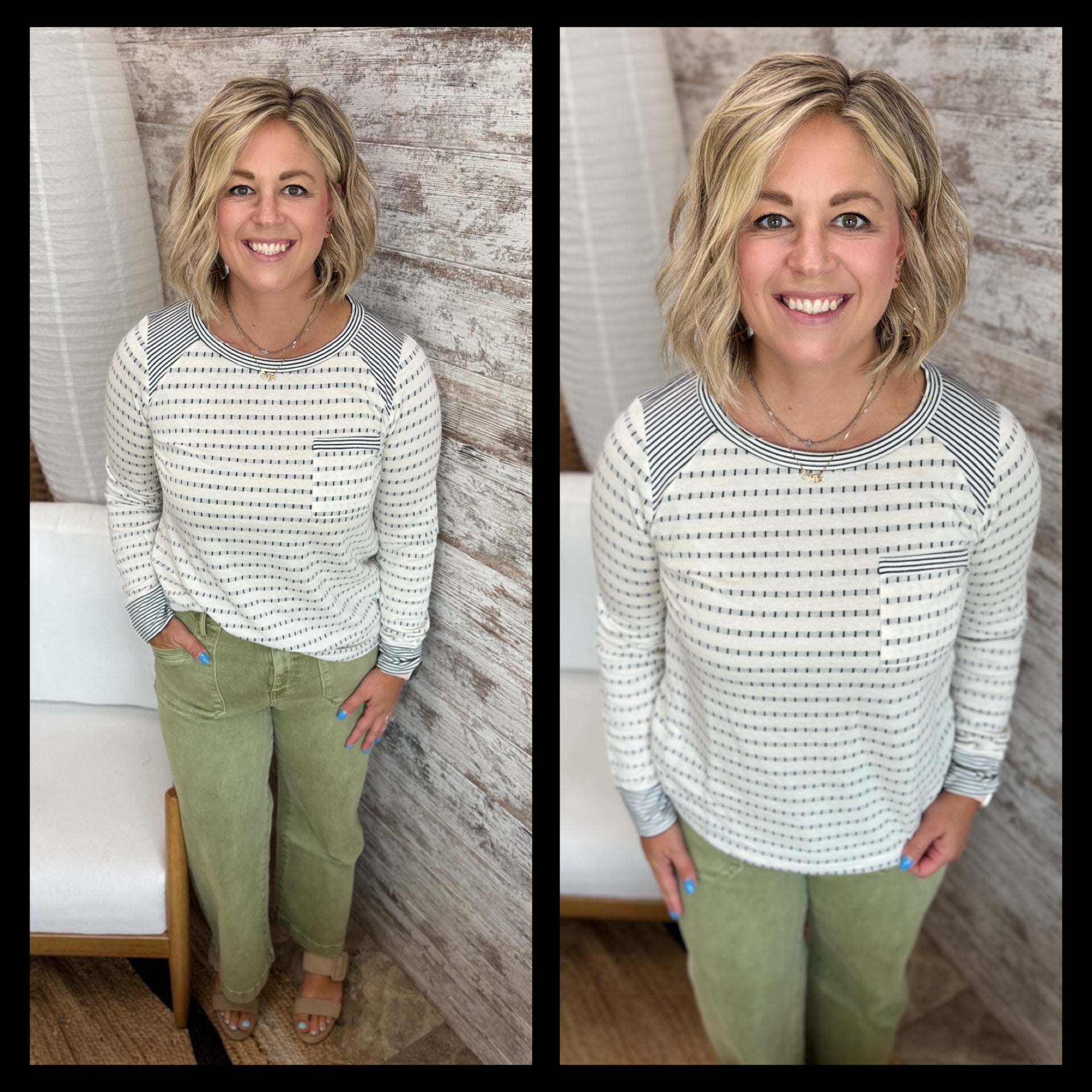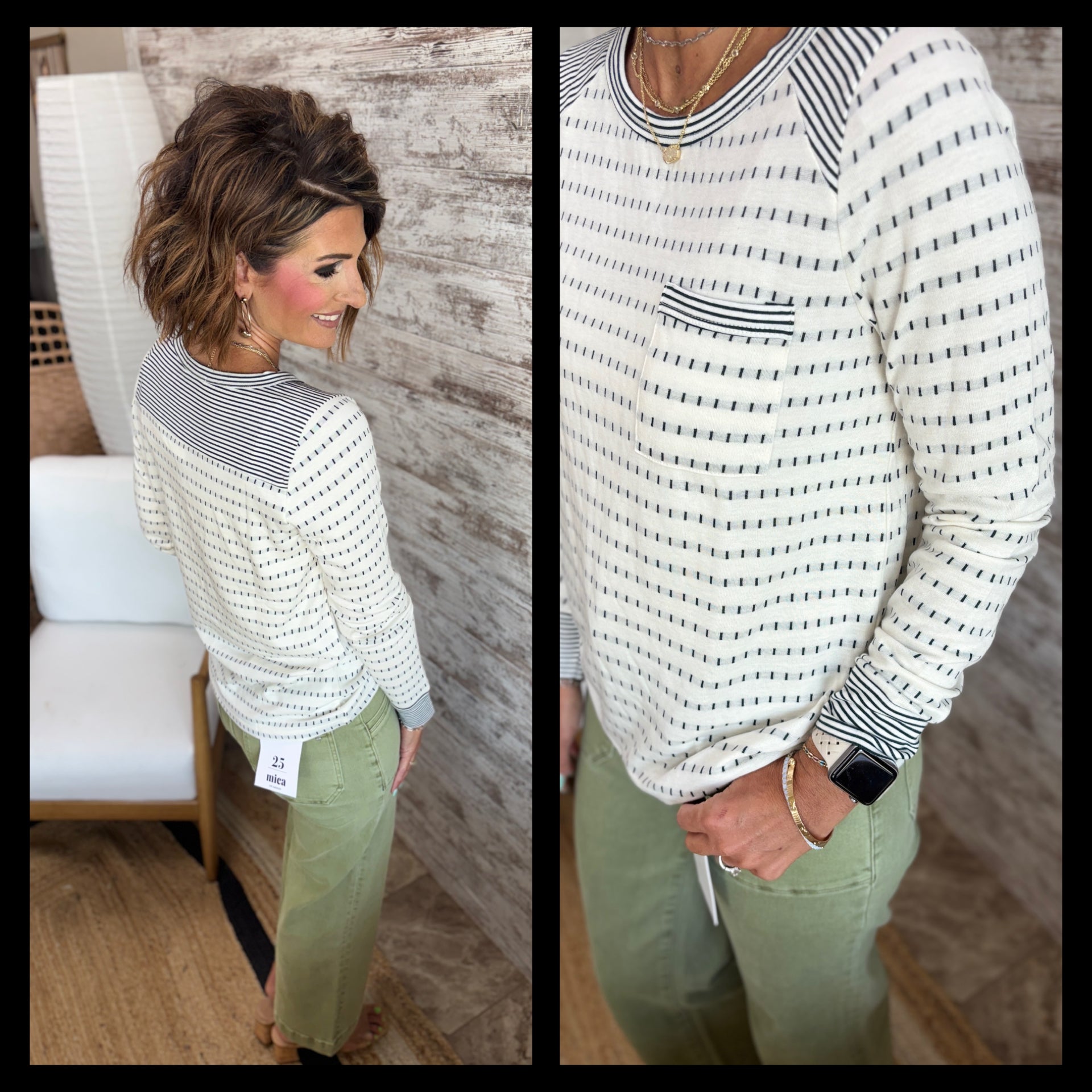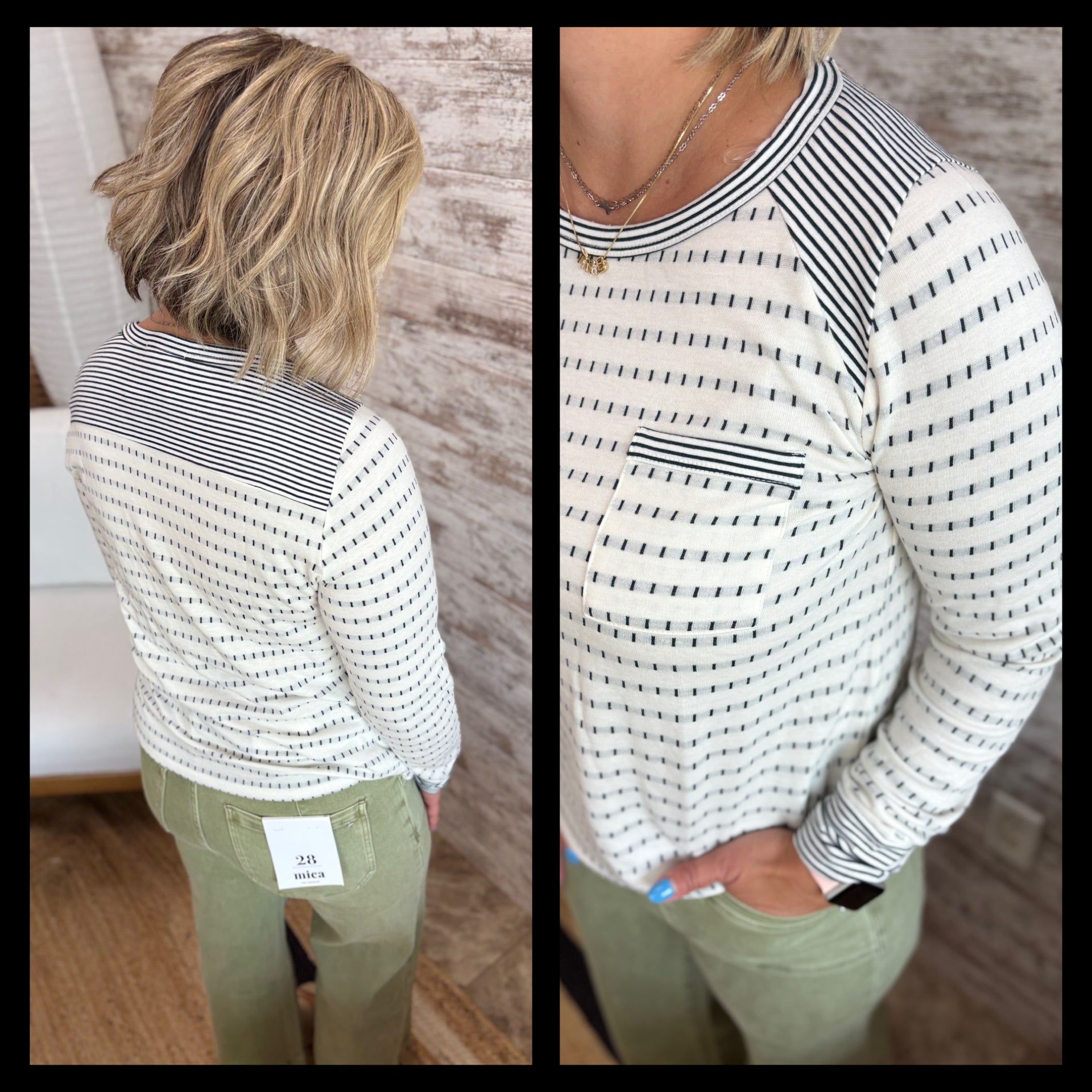 STRIPE MIXED, CHEST POCKET, LONG SLEEVE, DOTTED STRIPE, WIDE CREW NECK TOP