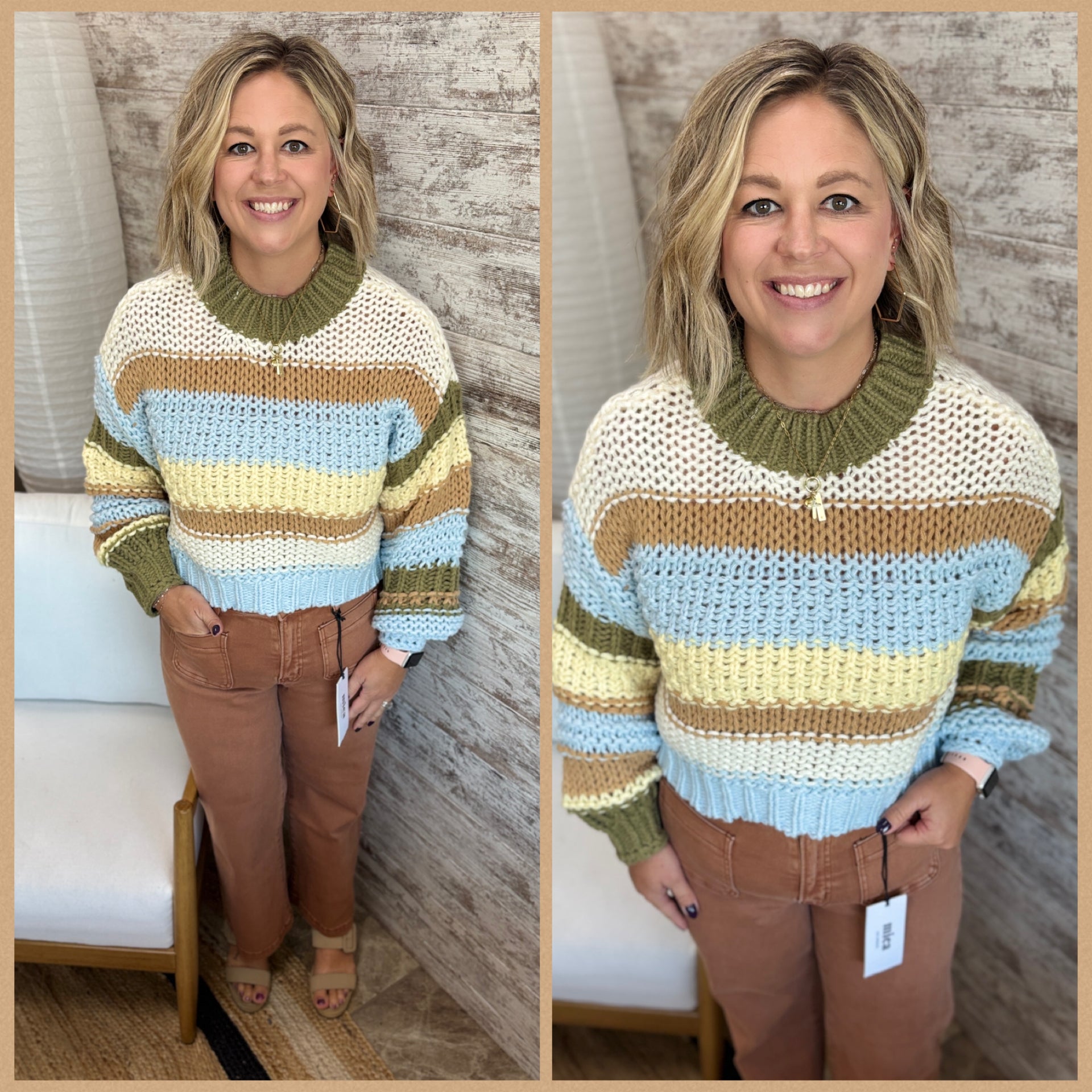 Ivory/Lt Blue/Olive Stripe Cropped Sweater