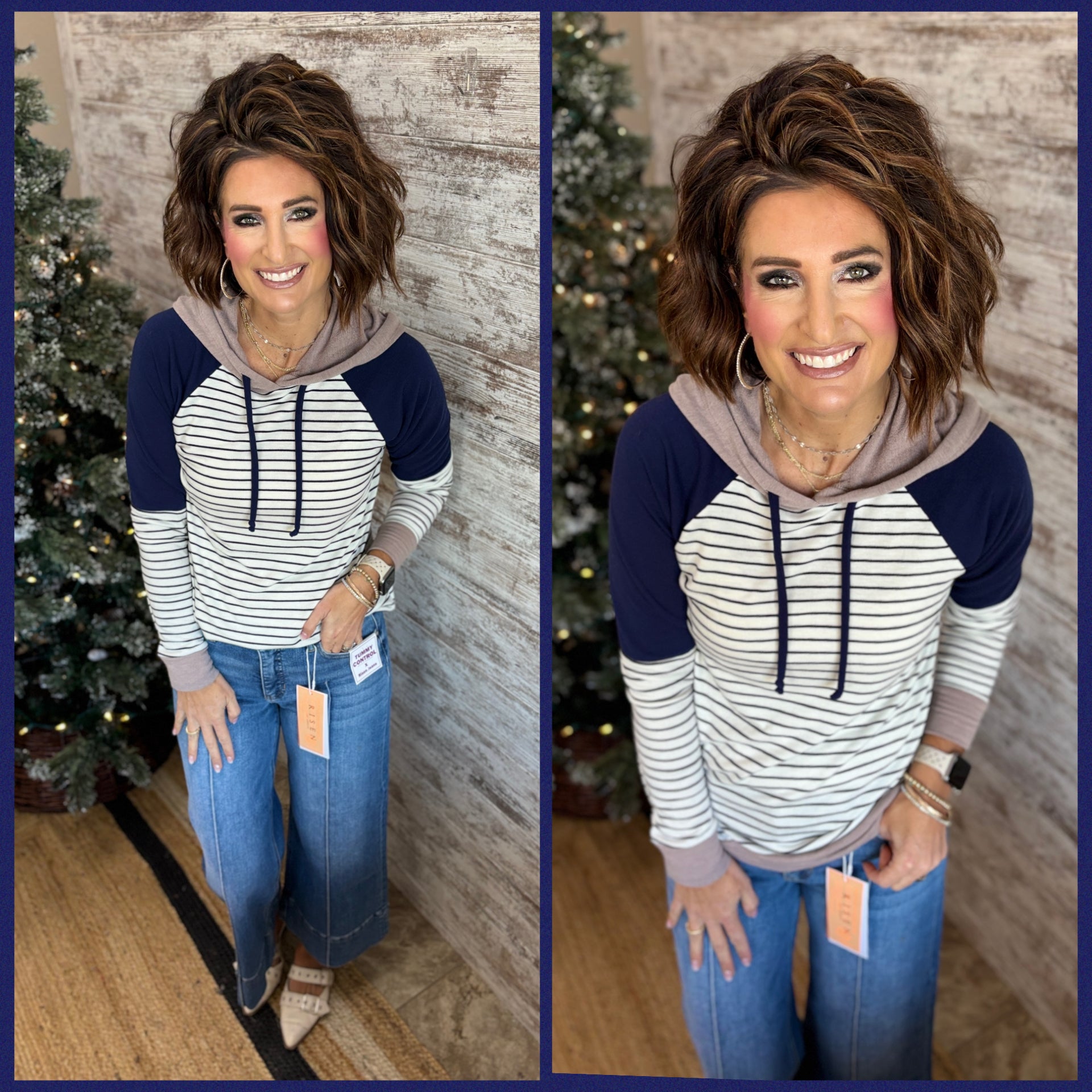 DRAWSTRING NECK, LONG SLEEVE, COLOR BLOCKED, STRIPED TERRY, PULLOVER HOODIE TOP