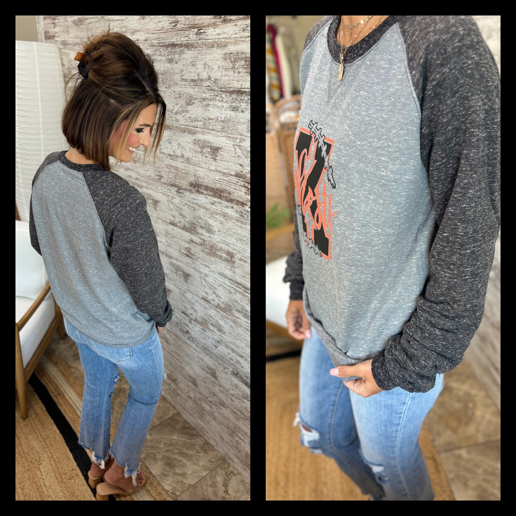 Printed on a Jerzee brand Heathered Charcoal Crew.