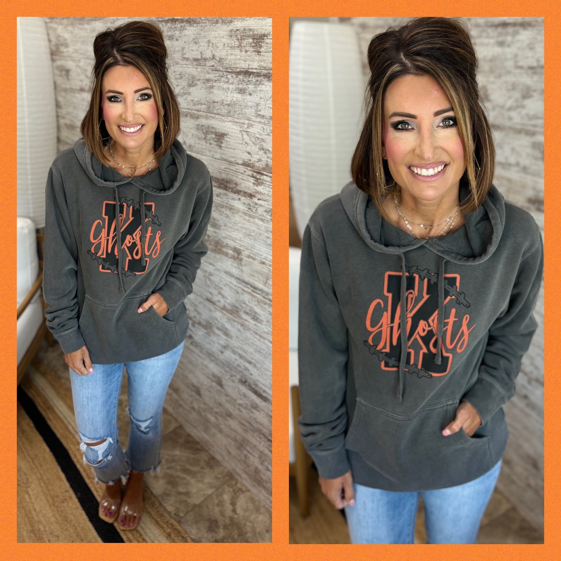 Kaukauna Ghosts Football Pigment Dyed Charcoal Hoodie
