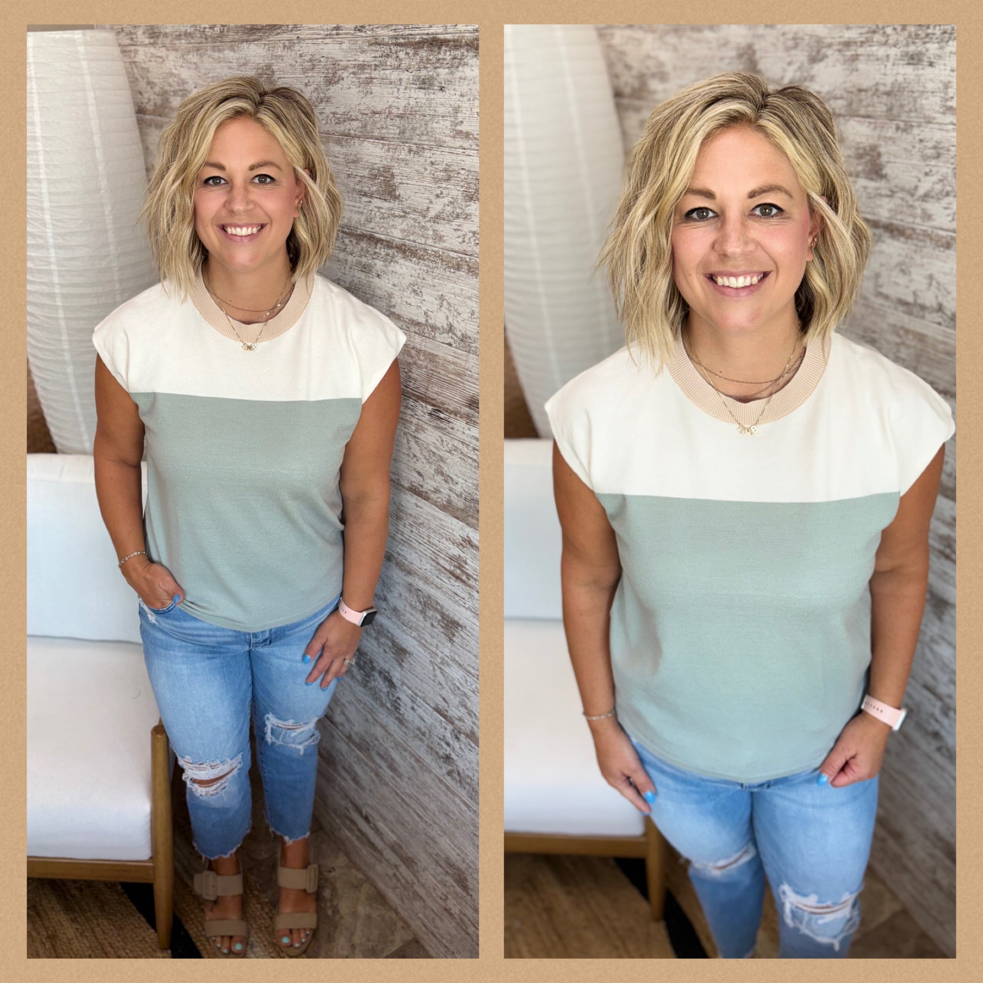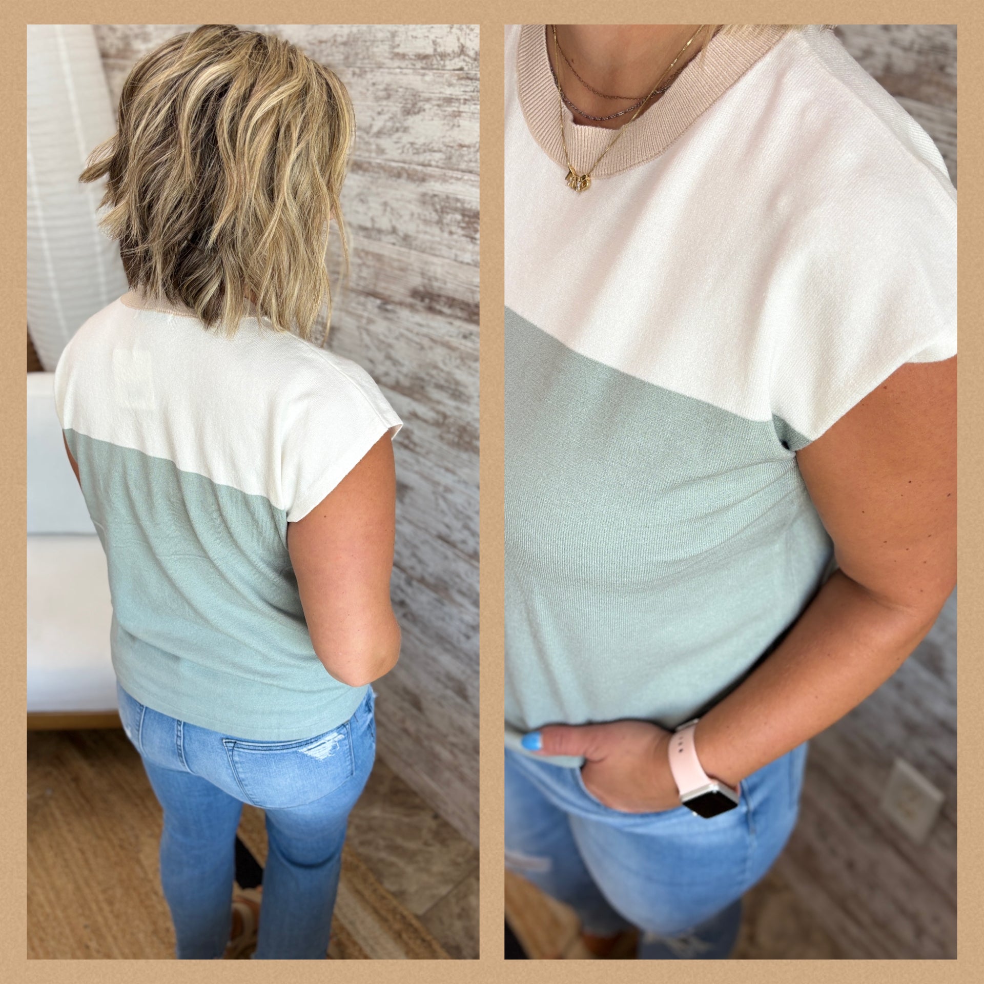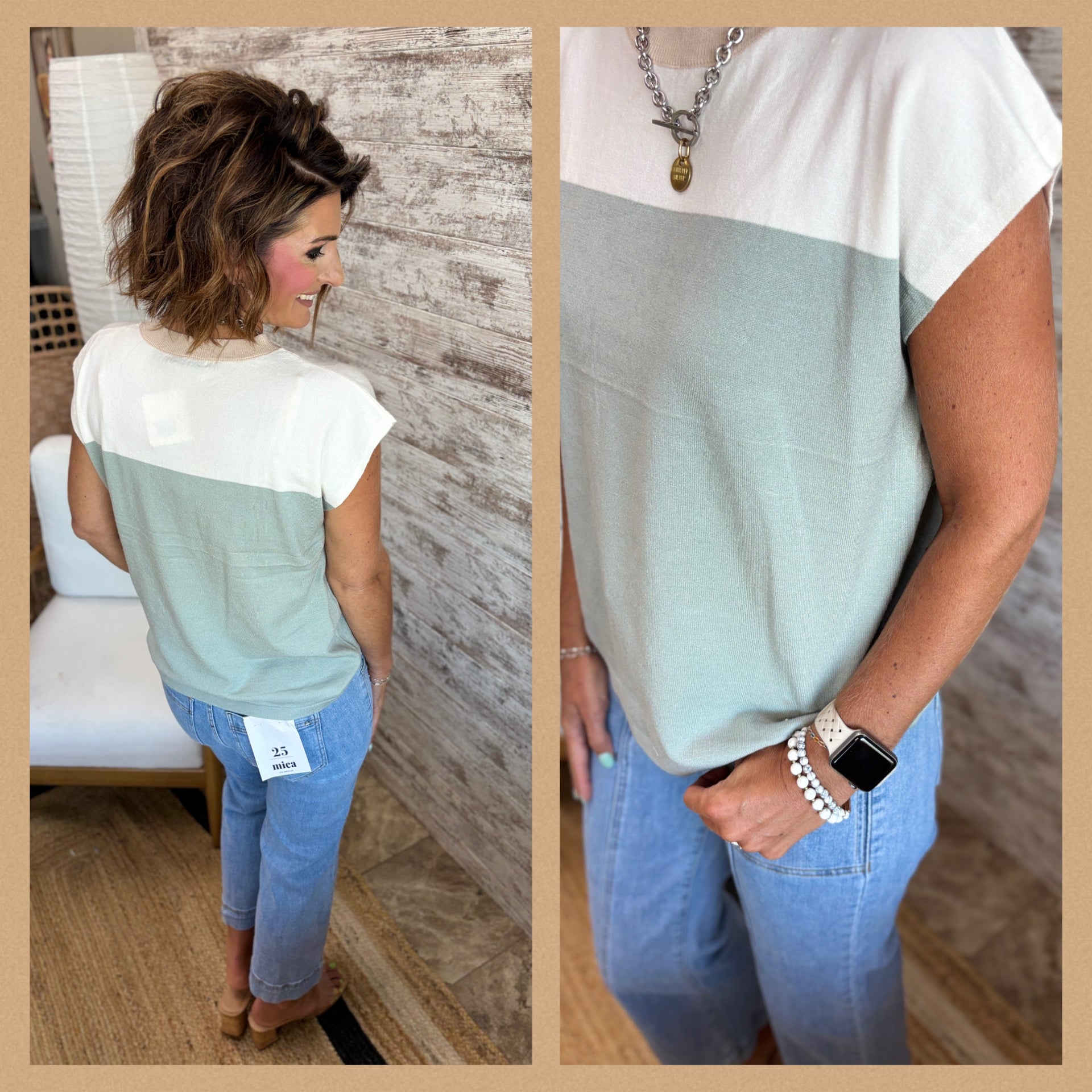 COLOR TRIMMED CREW NECK, EXTENDED SHORT SLEEVE, COLOR BLOCKED SWEATER TOP
