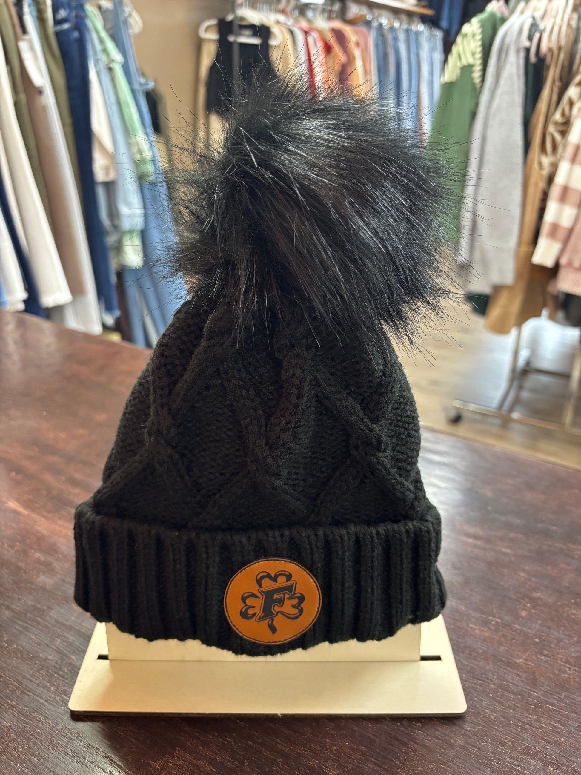 Totally on-trend, this women's beanie has a thick ribbed cuff and a cable knit crown that’s topped off by a fun faux fur pom.
