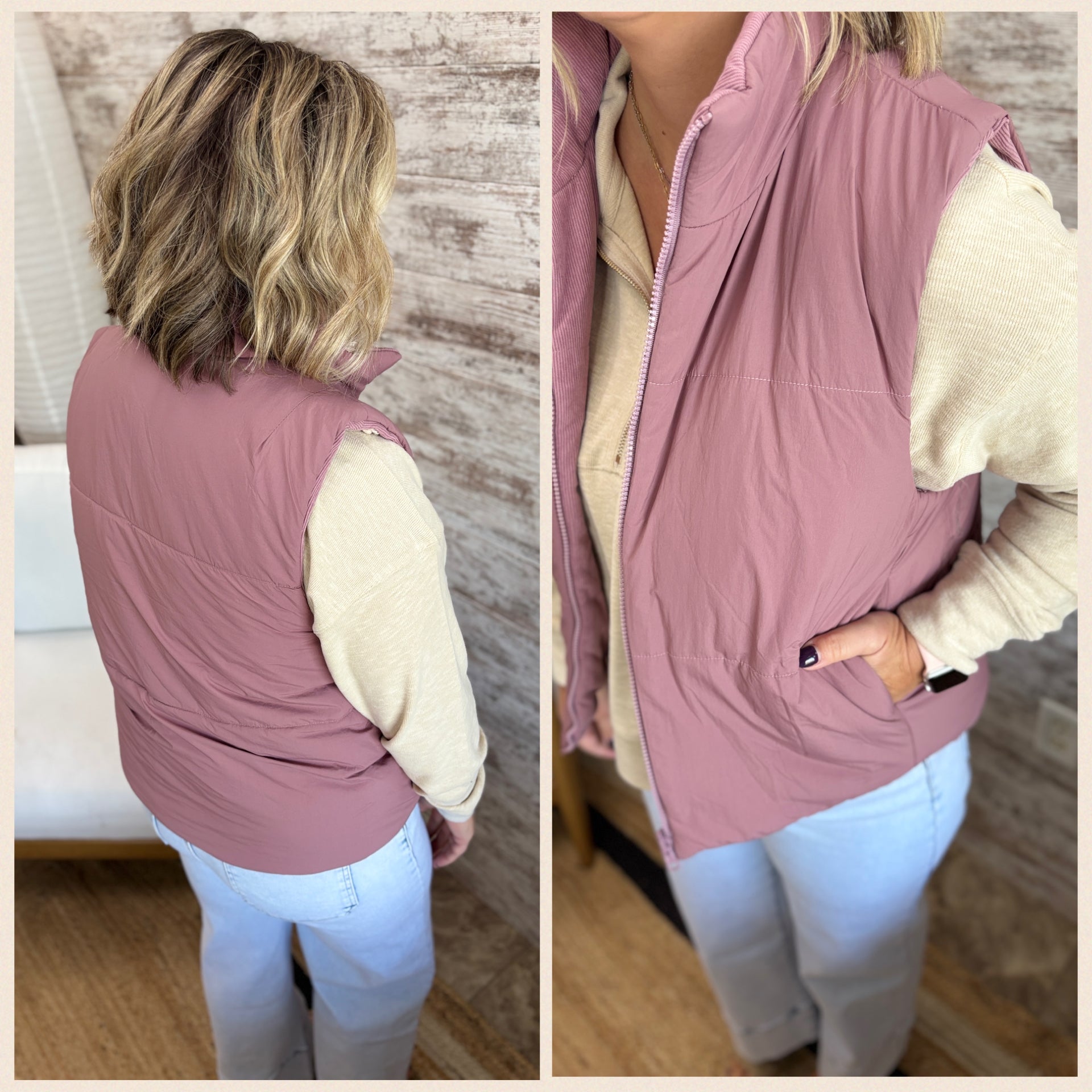 POLAR NECK, ZIP UP, CORDUROY REVERSIBLE PUFFER VEST WITH SIDE POCKETS