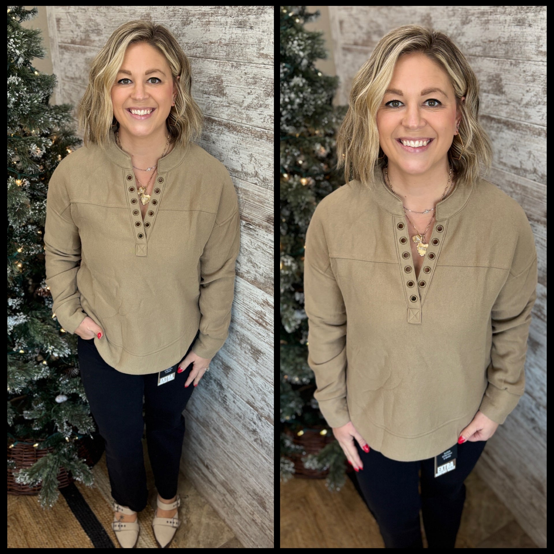 Spliced Grommet eyelet detail Long sleeves Seam border detail Solid Knit top