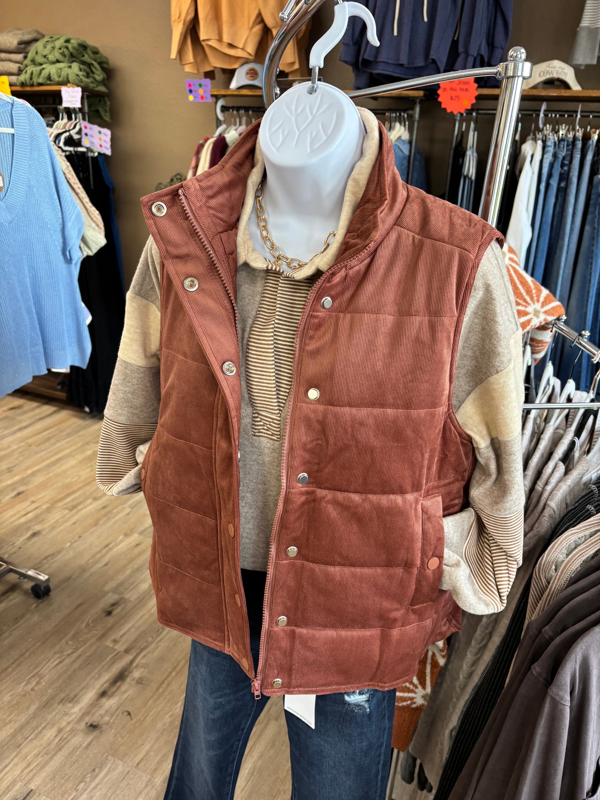 POLAR NECK, HIDDEN ZIP UP WITH SNAP BUTTON, MINI CORDUROY PUFFER VEST WITH POCKETS
